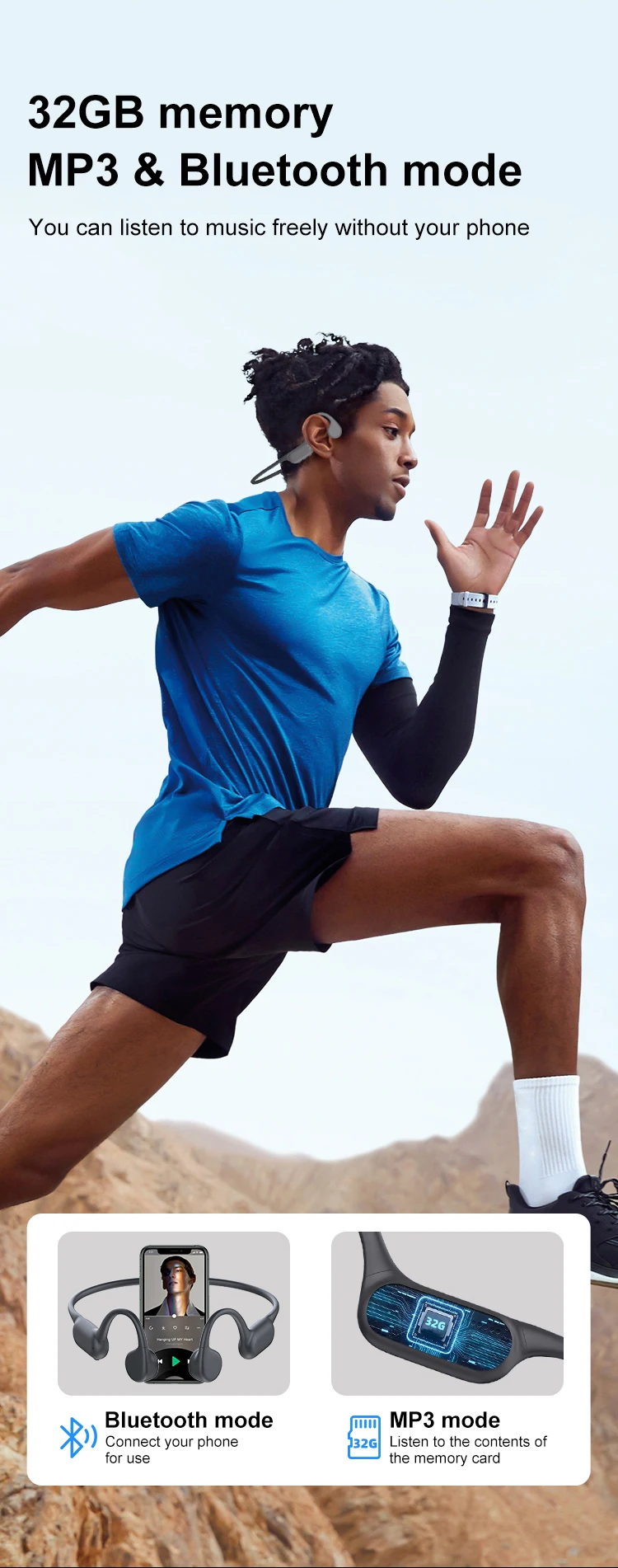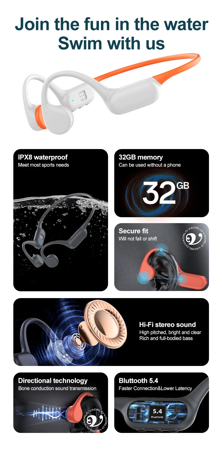 | Features20 | True IPX8 Waterproof Swimming Bone Conduction Wireless Headphone Bluetooth 5.3+32GB MP3 Player HIFI Sports Music Game Headsets |