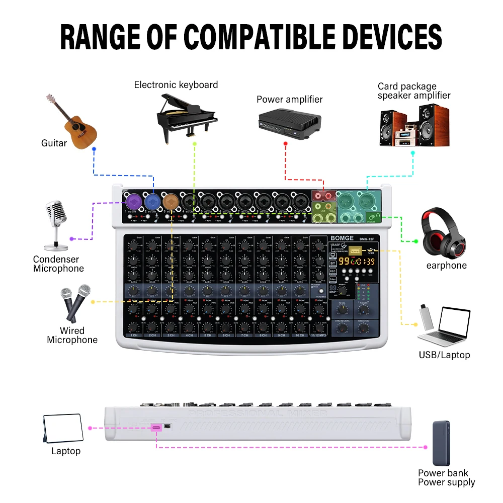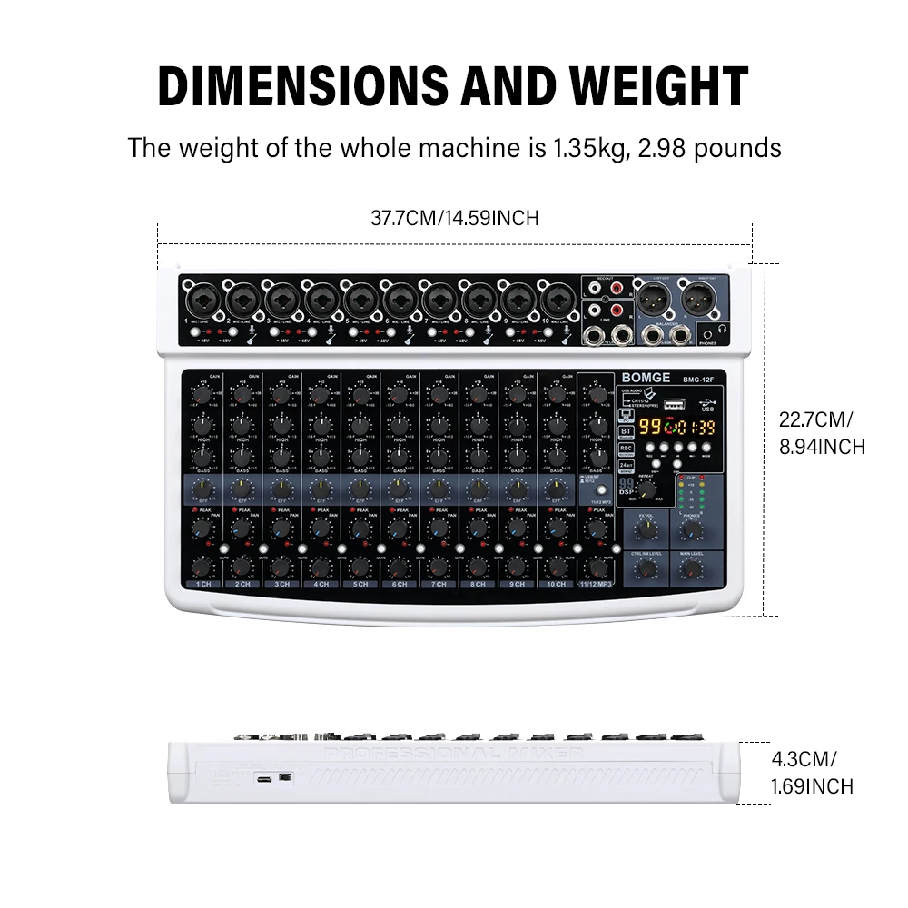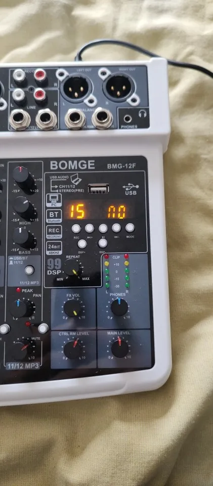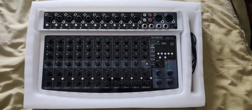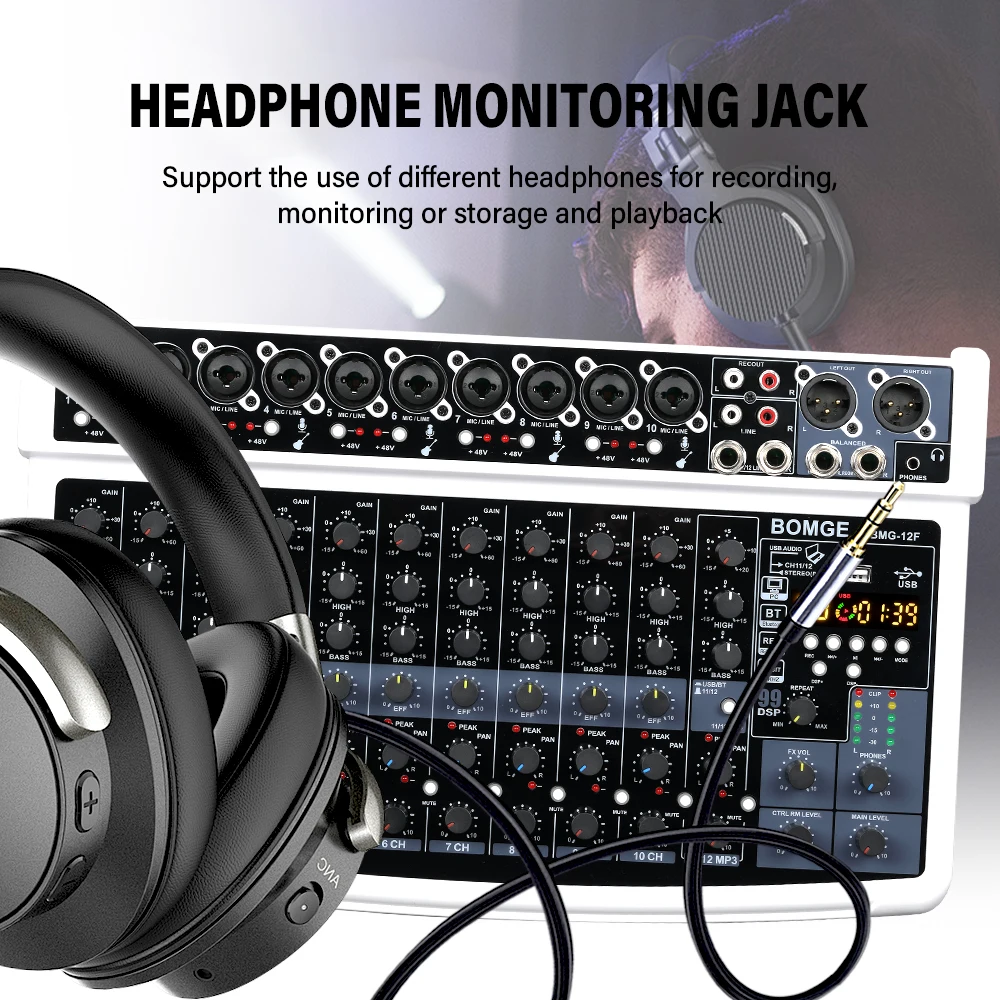 10 reviews for BOMGE 12-Channel Professional Audio Mixer, RCA, XLR Microphone Jack, 48V Power, 99 DSP For Professional and Beginners