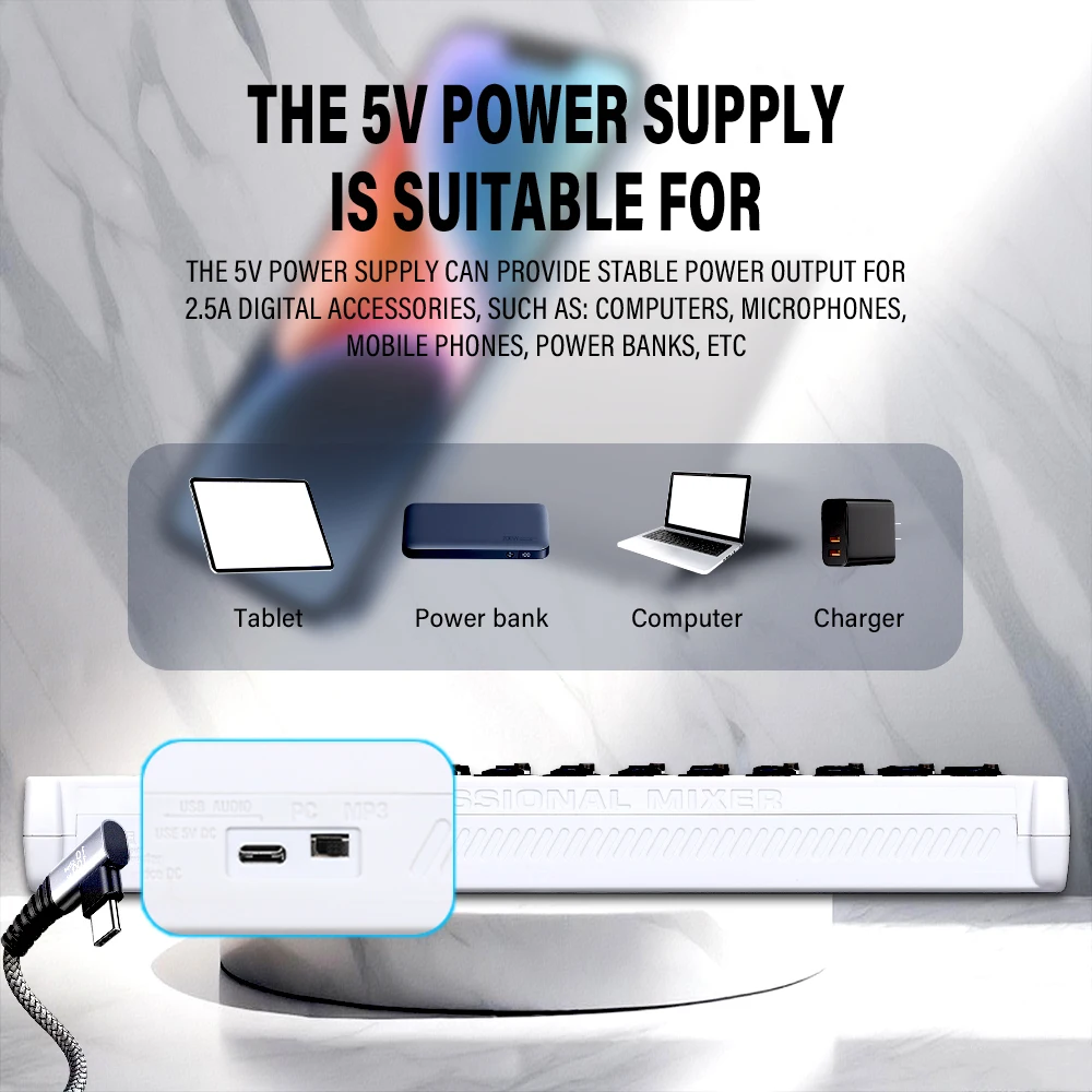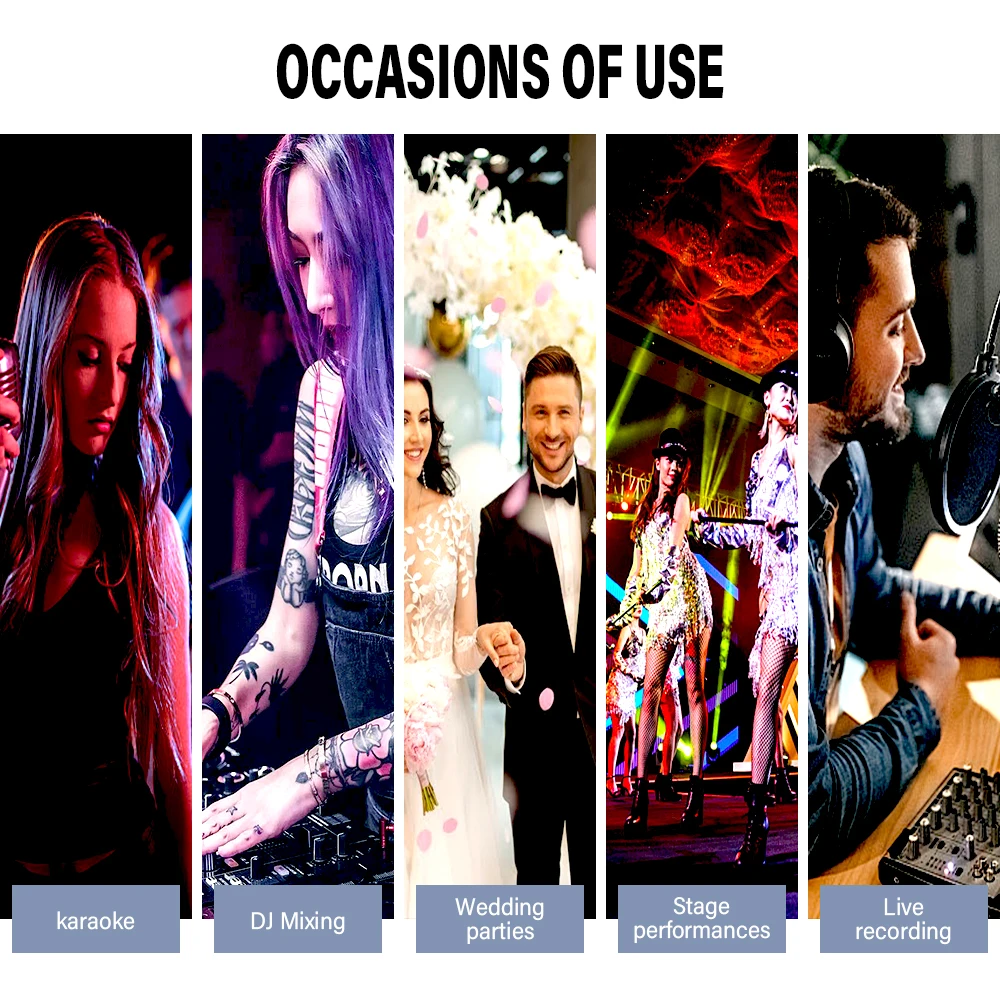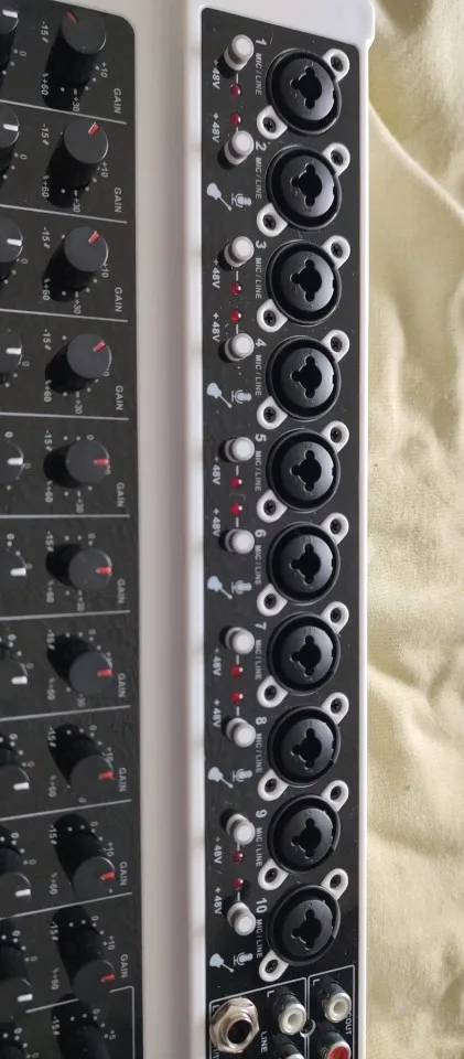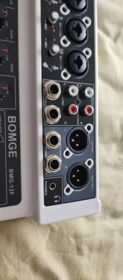 12 INPUTS: BOMGE DJ mixer USB audio interface mixer is equipped w/ 10 mic/line mono input for microphone, musical instrument/audio device, 6.35 jack (L/R) stereo input, RCA(L/R) input, and a USB port. It also has a 3.5mm headphone output jack