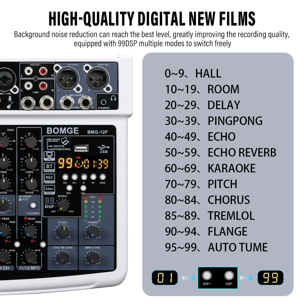 99 DSP s & Clear Screen Display:BOMGE professional audio mixer streaming system has a built-in sound effects processor w/ 99 digital effects that can be applied to synthesized/recorded sounds. The screen clearly displays the current effect in use for easy monitoring.