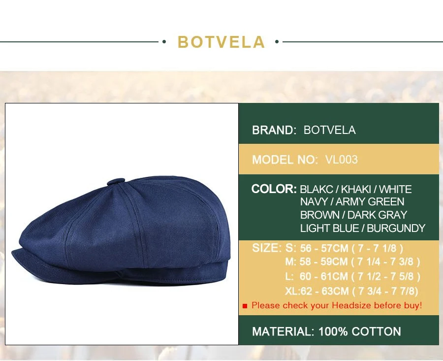 12 reviews for BOTVELA Men’s Newsboy Cap Twill Cotton 8 Panel Hat Flat Ivy Cabbie Casual Baker Caps Gatsby Hat Retro Hats Boina Beret for Male