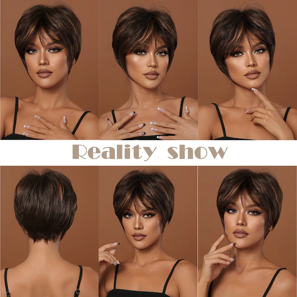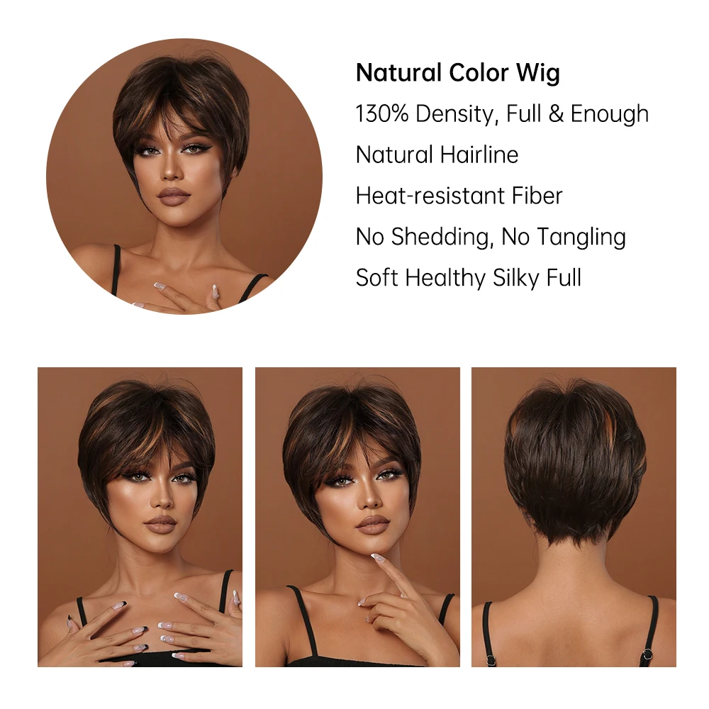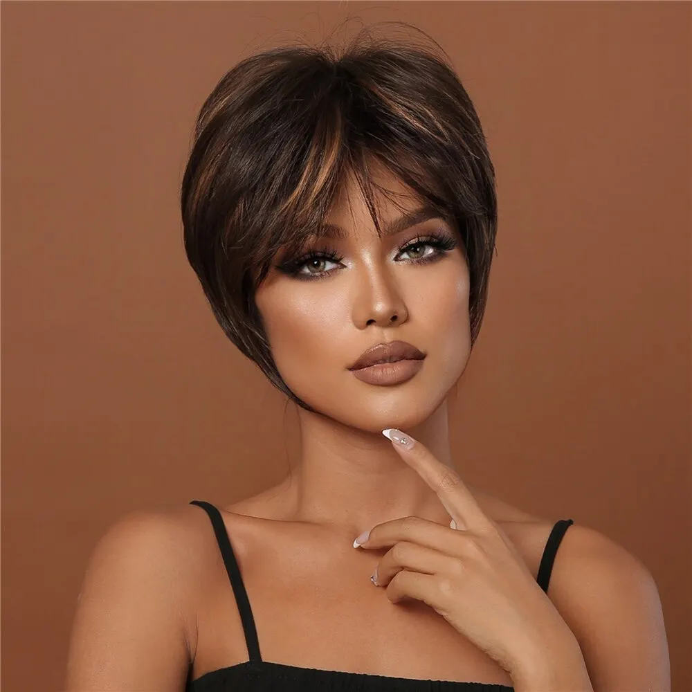 Brown Synthetic Hair Wigs for Black Women Short Pixie Cut Hair Wigs With Bangs Party Daily Use Wig Natural Hair Heat Resistant
