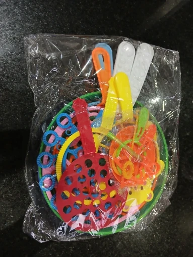 I’ve bought a similar product to this before from a different seller. Great price and good quality product. Perfect range of wands for normal and giant bubble mixture. The big and small trays are good for rationing out bubble mixture – perfect if you have a toddler that likes to shake or tip out the bottle!! They also double up well as a palette or tray for painting and other messy play activities.