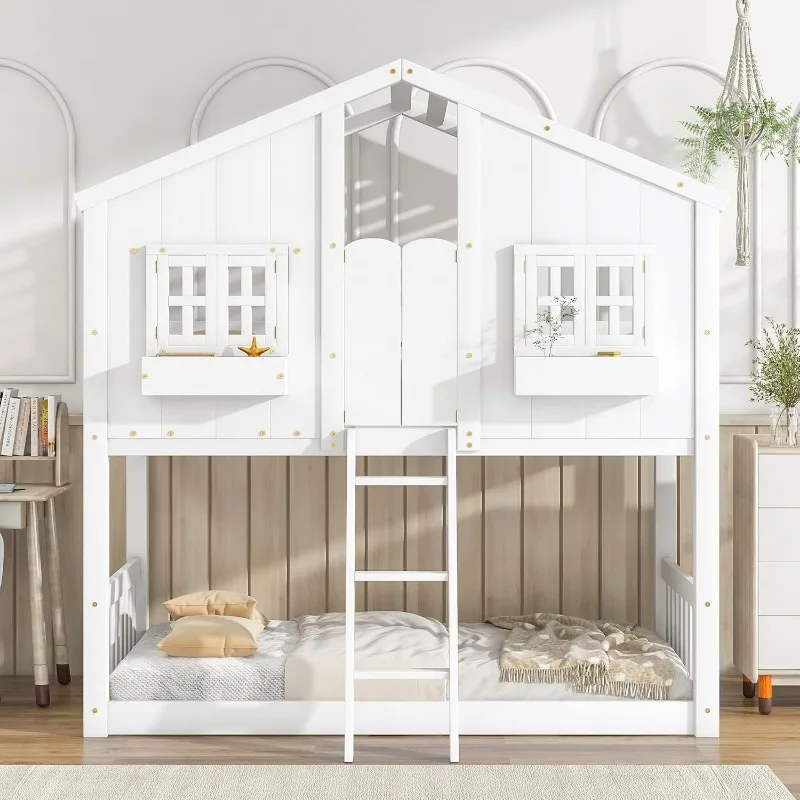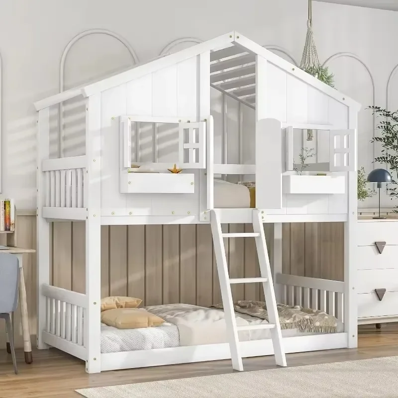 【Sturdy & Security Kids Bunk Bed Frame】 Our Beautiful twin over twin bunk bed crafted from high-quality solid pine wood, the bunk bed frame can last for long time use. Upper bed included slats kit, No box spring box is needed. Low Height Design, full-length high guardrails, the ladder is designed with a wider width to provide more spacious steps and solid support, making it easier for you to climb up and down the ladder.【House Shaped Bunk Bed Frame】 Our unique design bunk bed featuring a pitched roof and wall section with window and door, the Two storage boxes outside the window for storing books and daily necessities, this unique and intricately designed bunk bed creates a fun and adorable space that not only serves as a comfortable sleeping area but also double as a space for you to play and have fun.