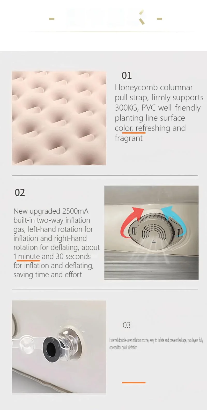 1.Built-in air pump device, inflates/deflates in 1-3 minutes.