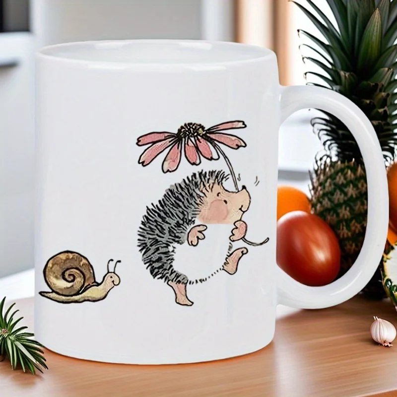 Ceramic Mug with Hedgehog Sniffing Flower & Snail Accent – Cute Garden Animals Coffee Cup, Brown Hedgehog & Pink Floral Design –