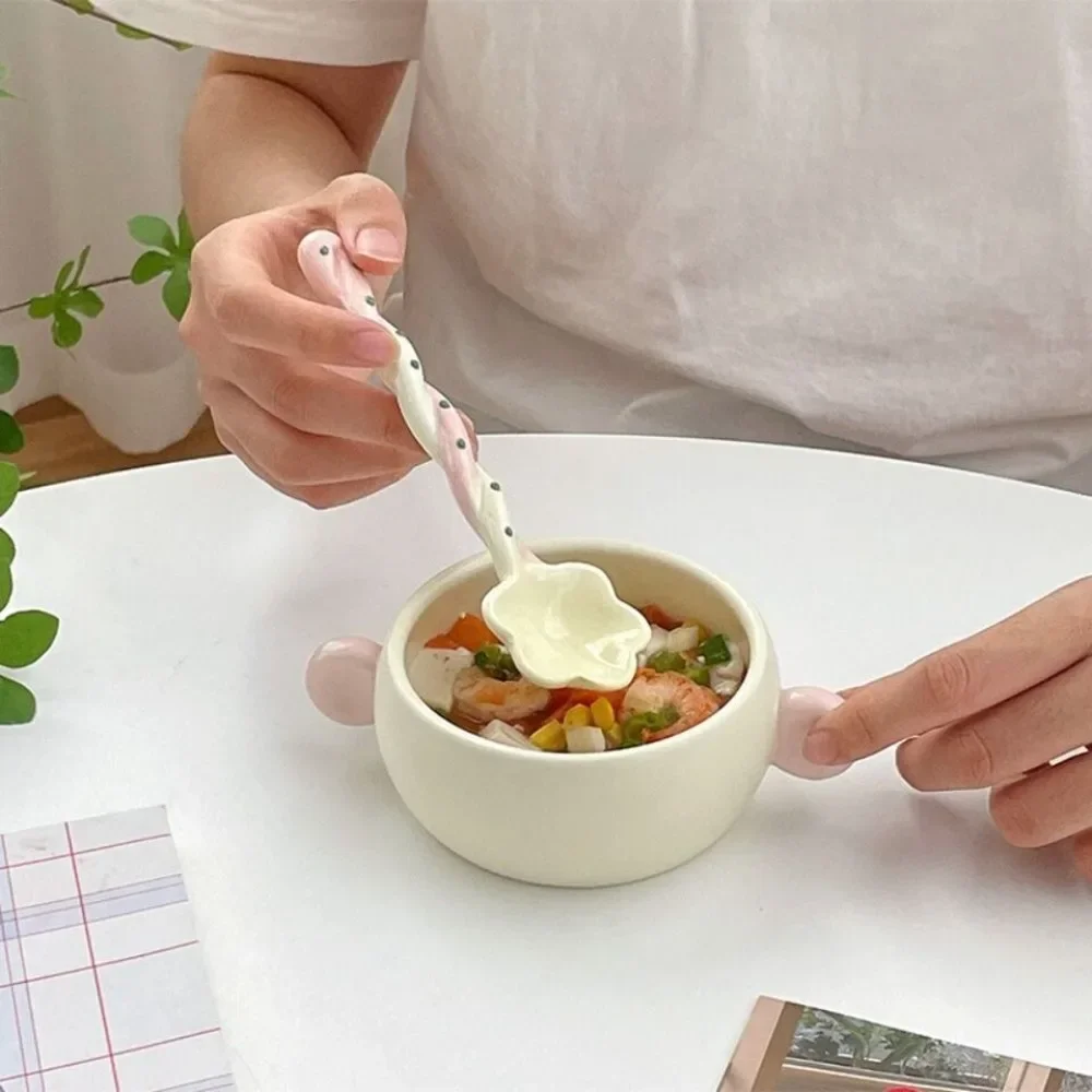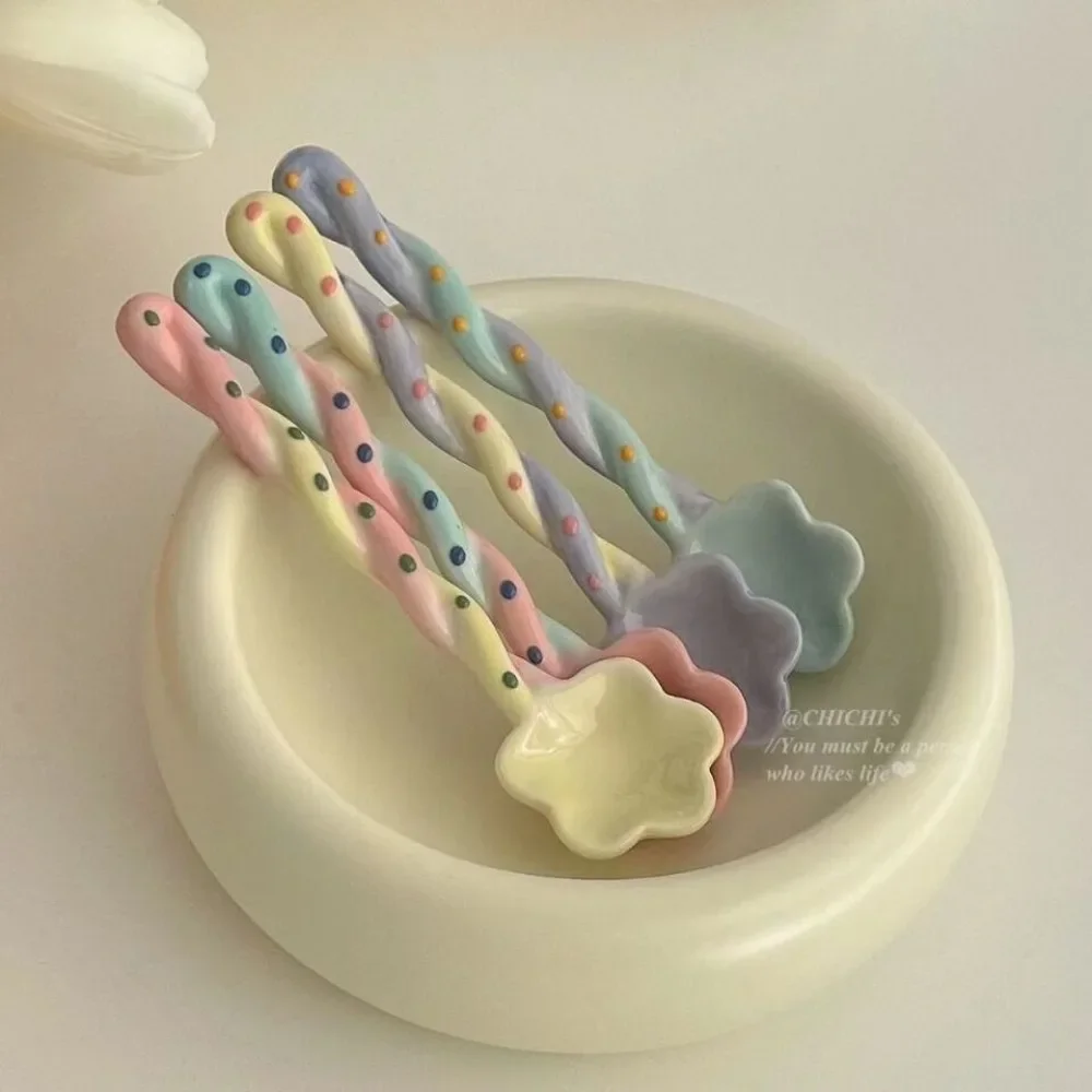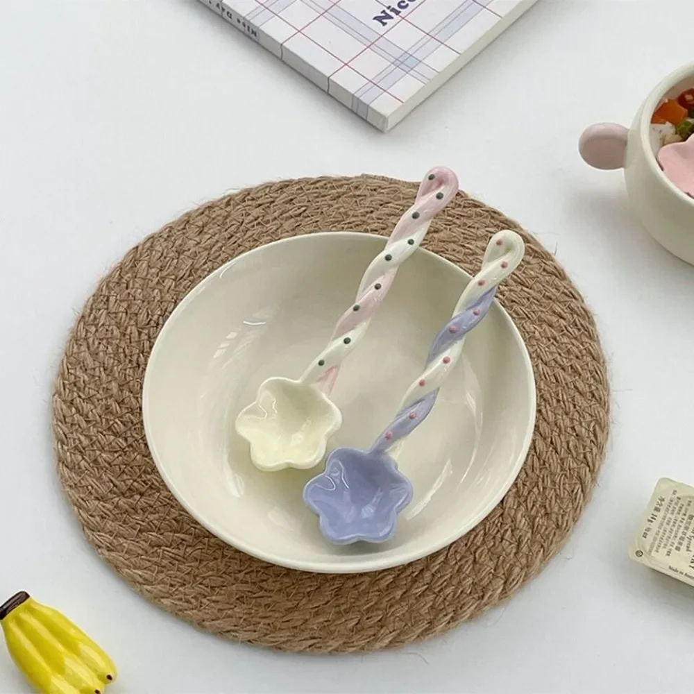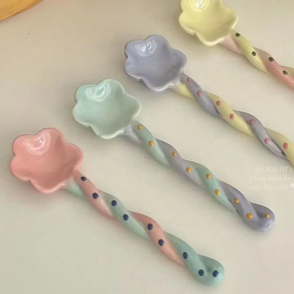 Ceramics Long Handled Spoon New Instagram Style Household Stirring Spoon Hand Painted Flower Shaped Coffee Spoon