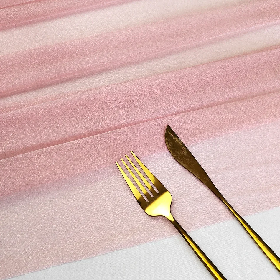 Material: 100% Polyester. Thermal cutting no seaming technique makes this sheer table runner more graceful than traditional fabrics. It shimmer a bit which looks elegant under lights, very flowy.