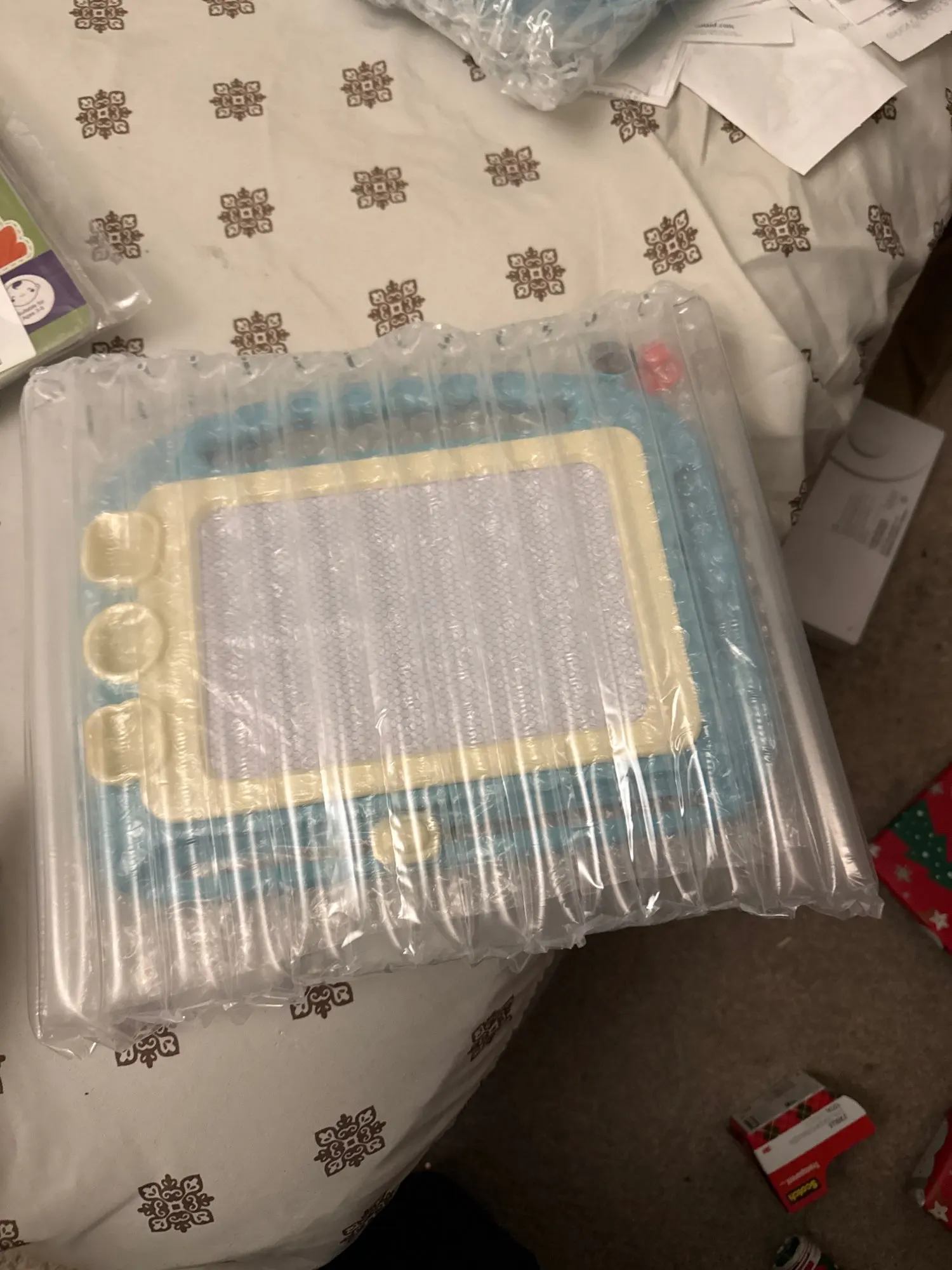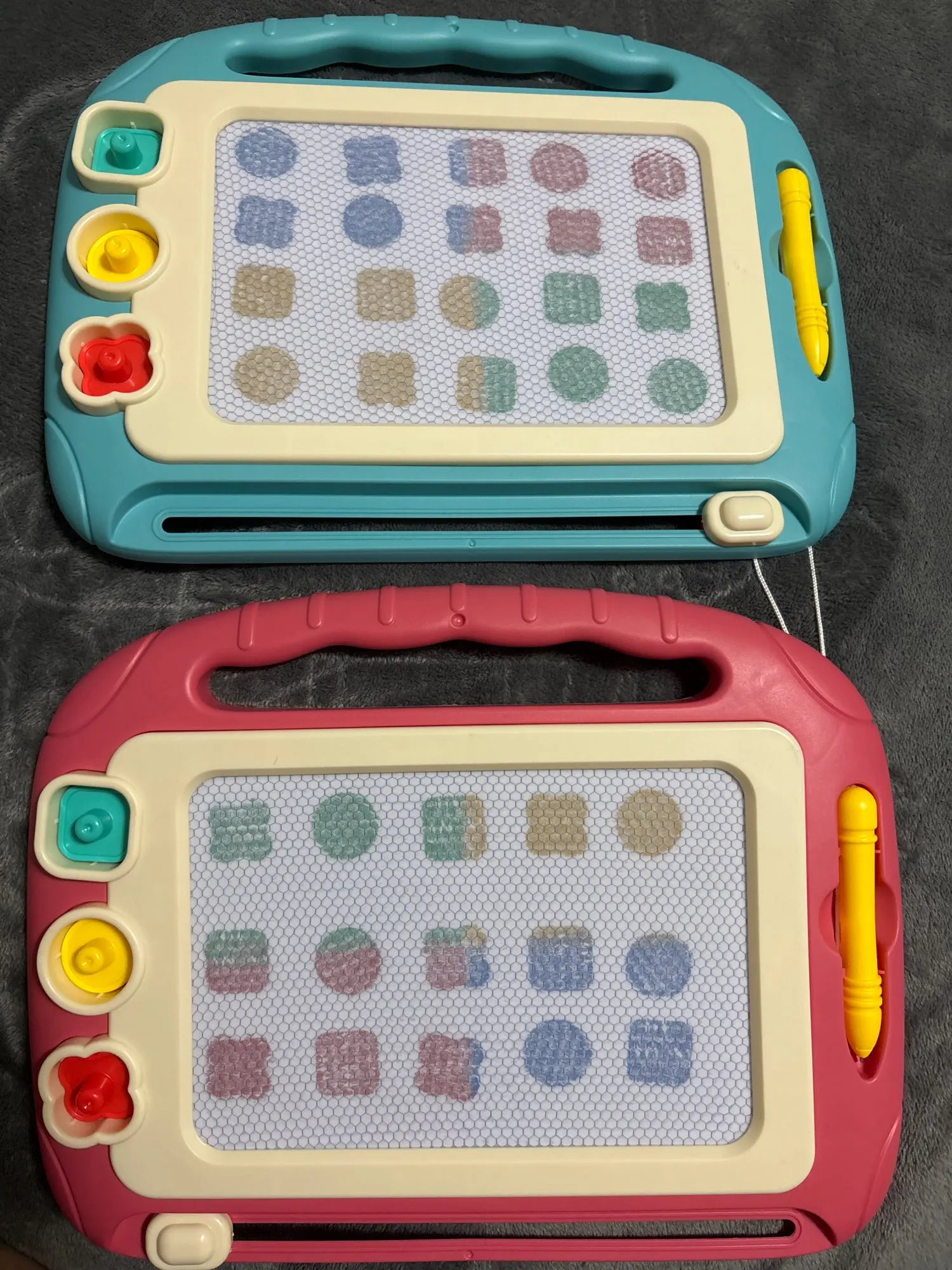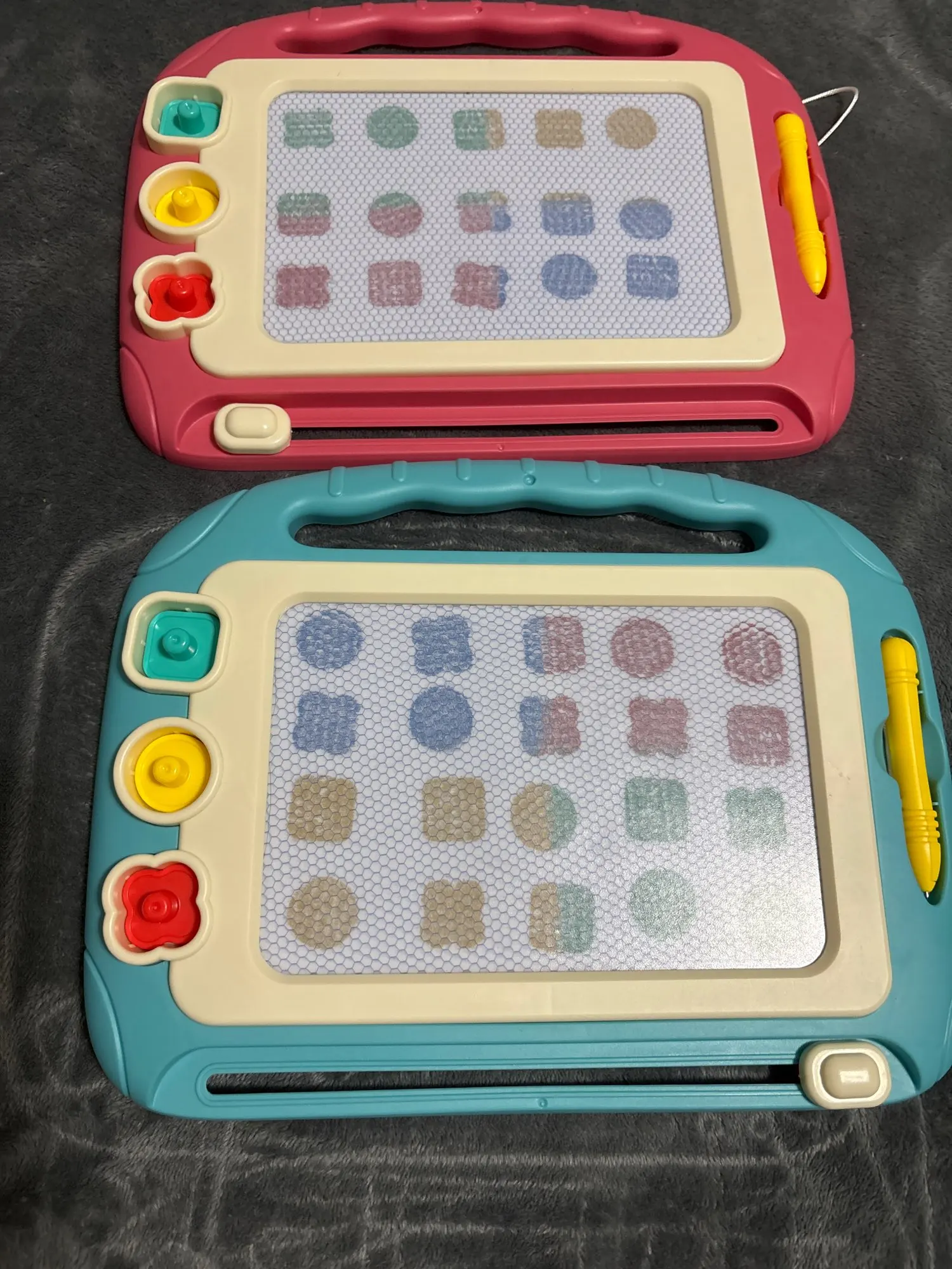 Simple in concept, just like the boards i used to scribble on as a kid but with more colors and the stamps are a cute feature. Works very well to keep my toddler entertained!