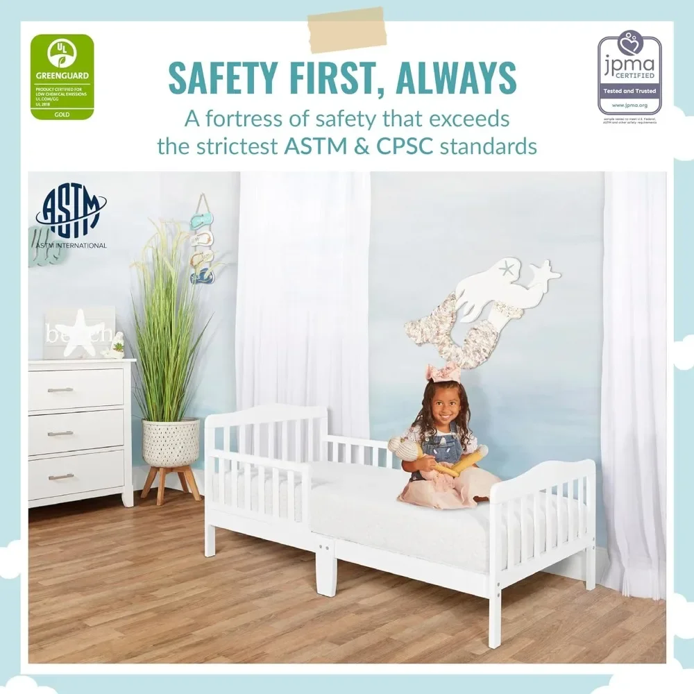 SAFETY FIRST: The toddler bed is JPMA certified and designed to meet or exceed all applicable ASTM and CPSC standards; It is free of phthalates, latex, lead and BPA and its design is ergonomic, stable and sturdy