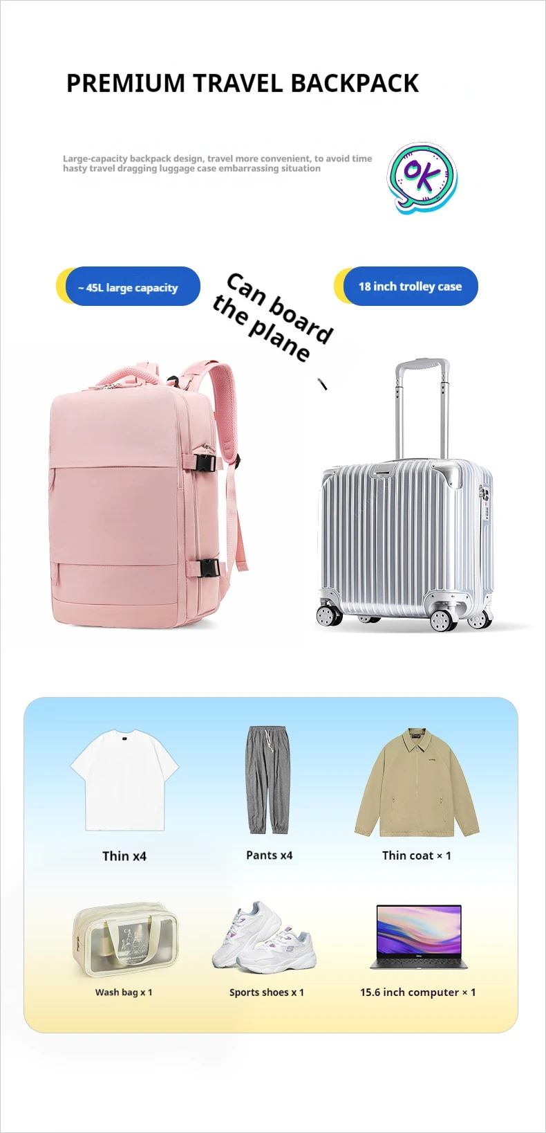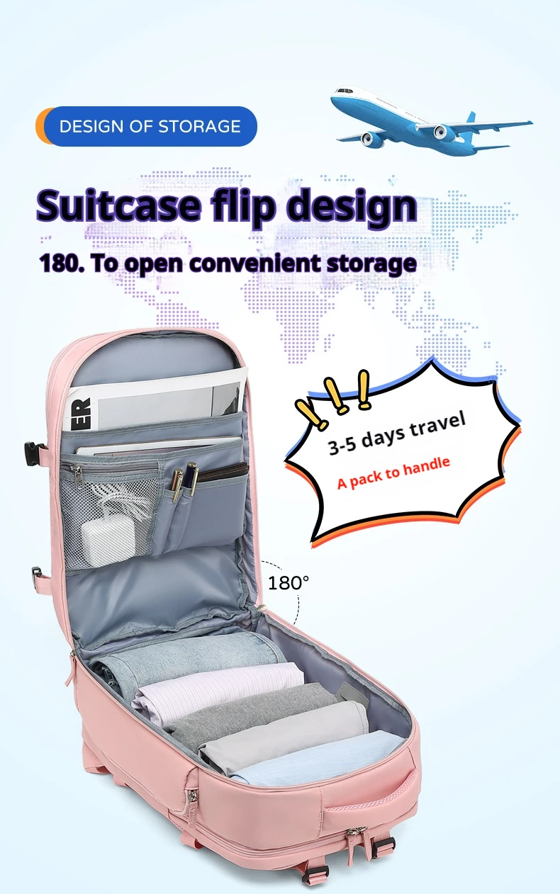 Colorful and versatile for casual wear. The fabric is waterproof and can be used even on rainy days. The storage space is large and can accommodate the necessary items for 3-5 days of travel. The computer compartment can also accommodate 15.6-inch laptops.