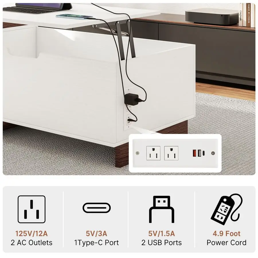 Charging Station DesignOur wood coffee tables for living room feature a charging station with 2 USB ports, 1 TypeC port, and 2 sidemounted output ports, making it convenient for charging phones or powering laptops.
