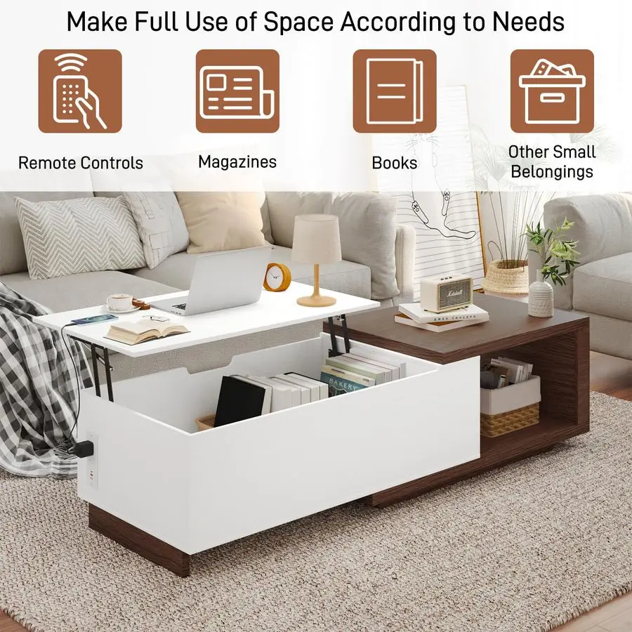 Coffee Table with Charging Station, 47.259 W Lift Coffee Table with Hidden Storage, Space Saving Center Table with Adjustable Sh