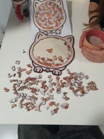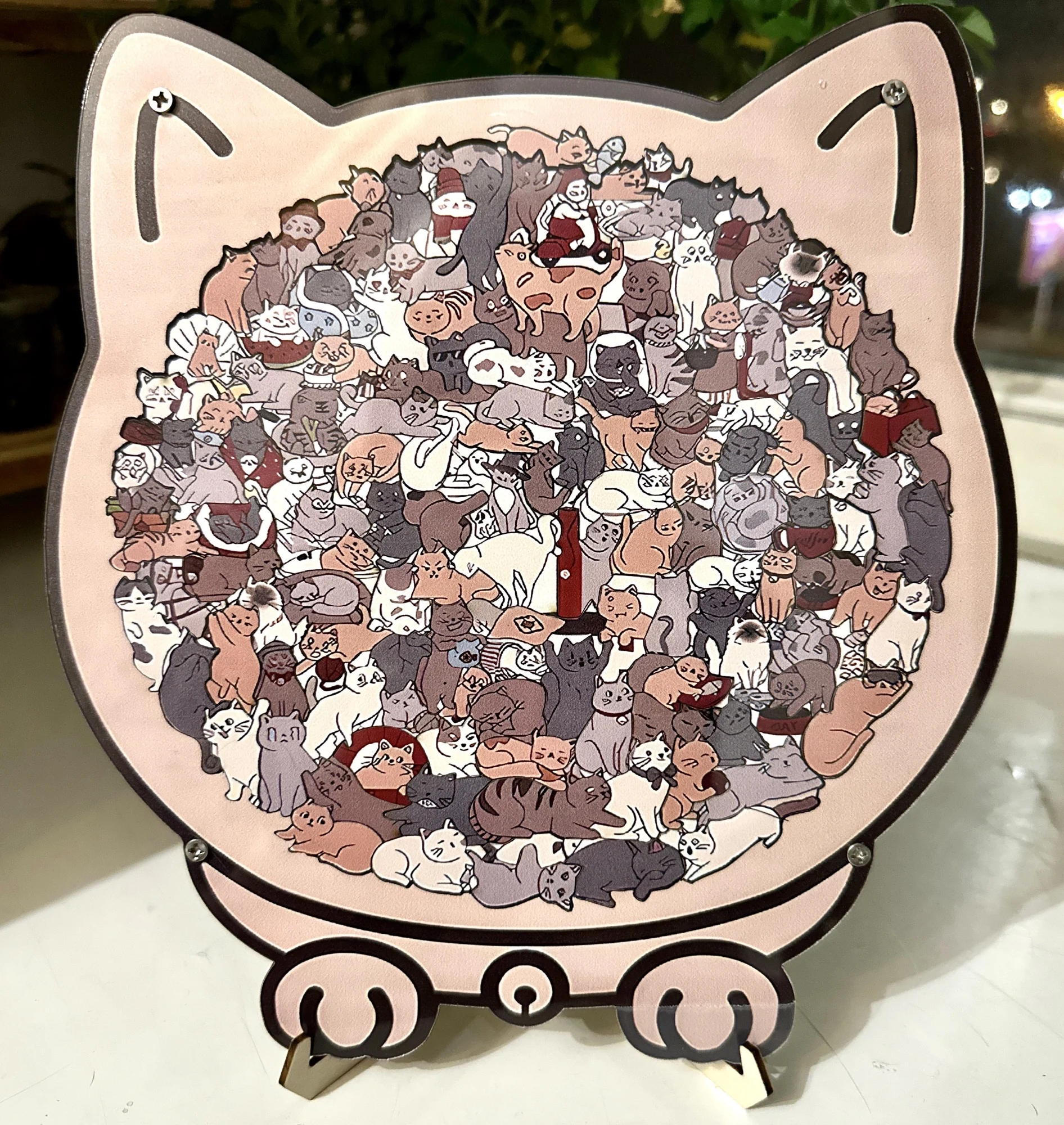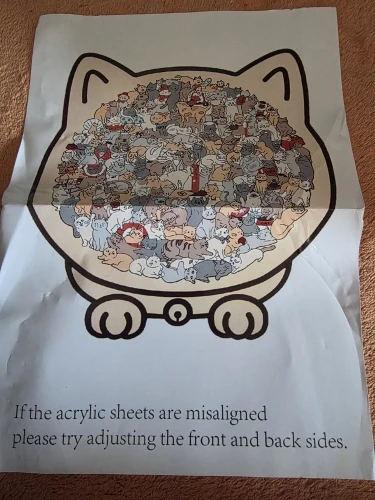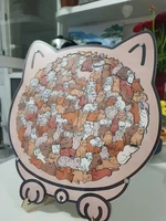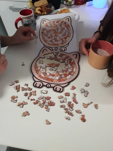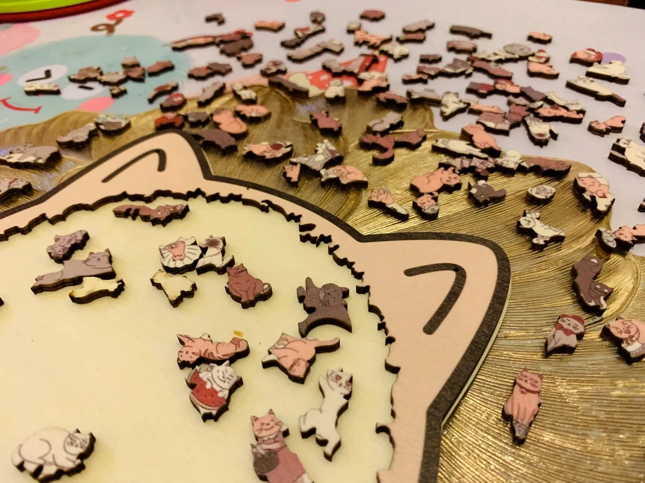 Great puzzle! I bought 2 pieces, for myself and as a gift. The assembly time for three participants is 50 minutes. The cats are cut not according to the contour of an individual cat, but in fragments of different cats. At first, it may seem strange and even a bit nerve-wracking, but towards the end of assembly, it becomes even more fun. The set includes legs and protective glass, with protective film on both sides. After assembly, it can be installed as a small panel. Highly recommended. A cool thing!!!