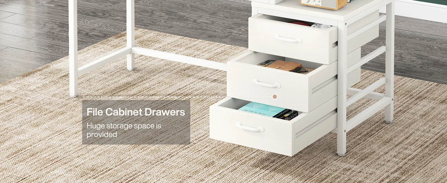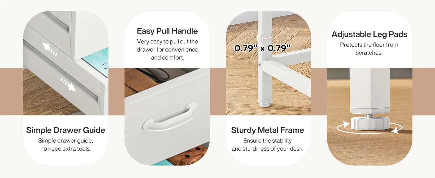 - [RELIABLE AND STURDY CONSTRUCTION]: Made of high quality E1 particleboard and MDF board, this desk with storage is built to last, reliable, sturdy, wear and scratch resistant. The premium thick metal tube frame ensures the stability and sturdiness for the work desk. Adjustable leg pads help the drawer table stands stably on uneven floor.