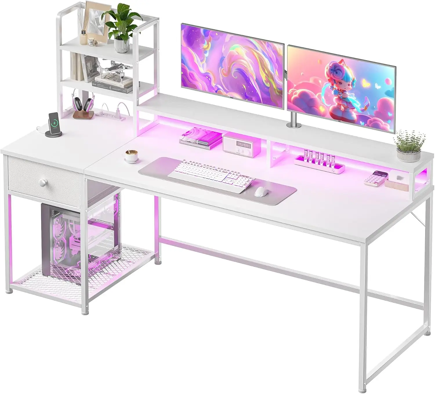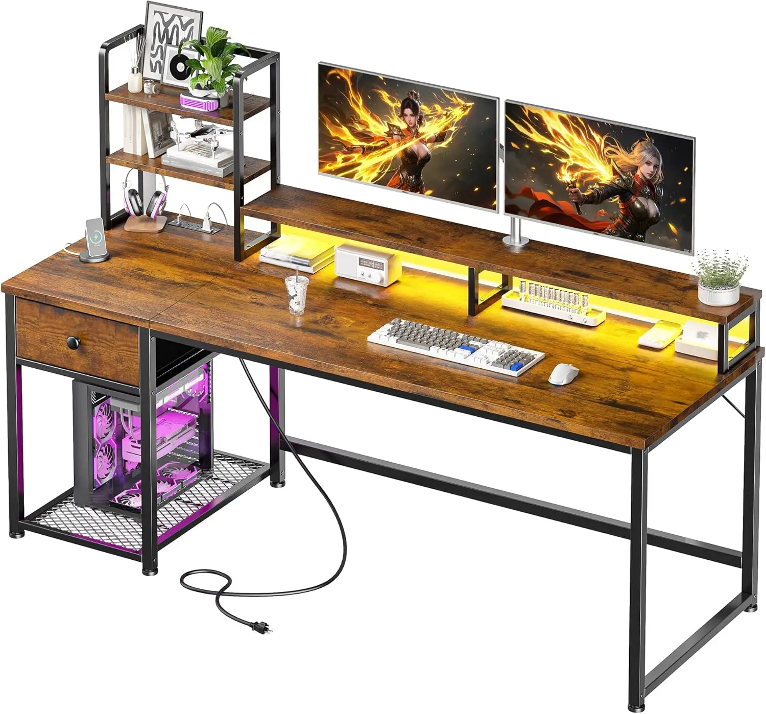 Computer Desk with Hutch and Drawers,Reversible Home Office Desk with Monitor Shelf, Gaming Desks with Power Outlets, Customized
