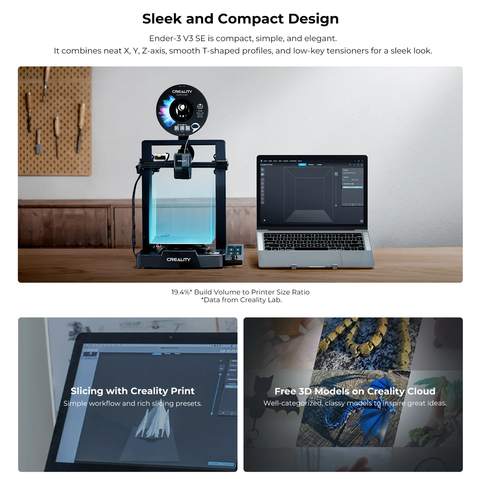 Ender-3 V3 SE 3D Printer:  Ender-3 V3 SE is compact, simple, and elegant. It combines neat X, Y, Z-axis, smooth T-shaped profiles, and low-key tensioners for a sleek look. Smaller to place around, but it still offers an ample build volume – 220*220*250mm.Â