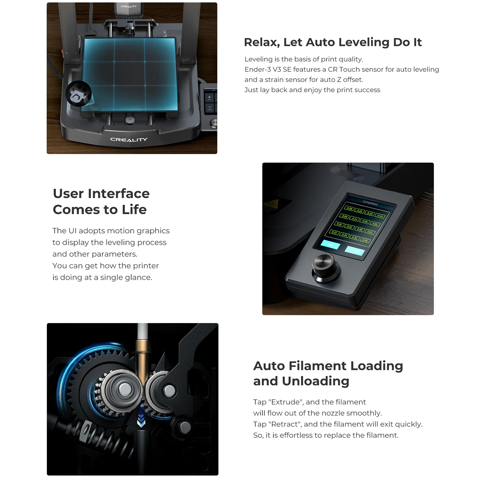 Auto Levelling Printing Platform:Â Ender-3 V3 SE features a CR Touch sensor for auto levelingand a strain sensor for auto Z offset.Just lay back and enjoy the print success. And adpot PC Spring steel heat bed, fast to heat up and easy to take off the model.