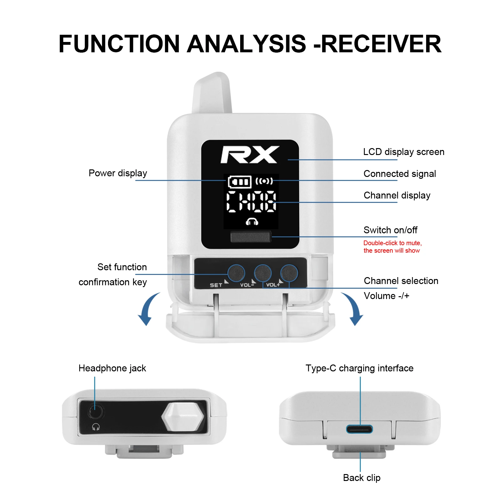 This is a stereo portable and practical mini wireless in-ear monitoring system, which is convenient for outdoor performances and recording monitoring. It has a good signal transmission distance and clear sound transmission. The built-in lithium battery can be charged via the TypeC interface and can be used for about 10 hours when fully charged. When the signal is interfered, you can manually switch the frequency to avoid signal interference and enhance the applicable usage scenarios.