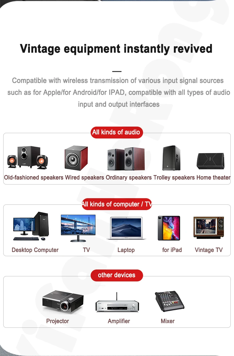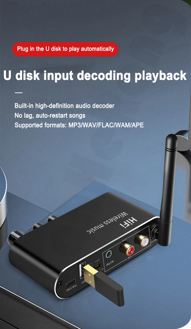 12.Super Stable Connection:Our Bluetooth-Compatible audio adapter is fitted with a Bluetooth-Compatible 5.0 chip for steady pairing, fast transmission and a wide signal range (33 feet). With the 3.5mm AUX port and 2 RCA port, it can be connected to non-Bluetooth-Compatible car audio systems, home stereo, wired headphone/speaker, Amplifier/Home Theater.etc. Then you can enjoy wireless Hi-fi music streaming! Note: It's a Bluetooth-Compatible receiver only, not a transmitter. So you couldn't use it for your keyboard, mouse.