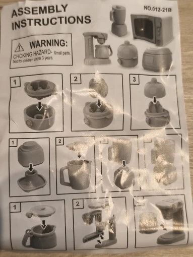 This product comes as a bag of parts with no written instructions;however, i found putting this kitchen set together very enjoyable. It took more than a few minutes to sort all the parts out, but the end result is a very cute little kitchen set. I’d order it again!