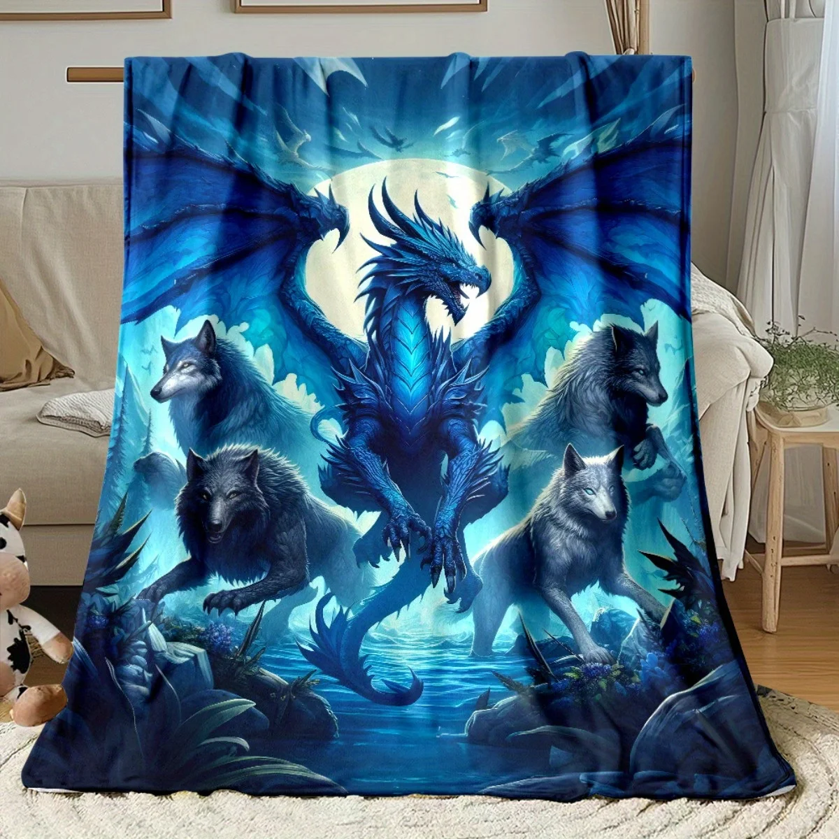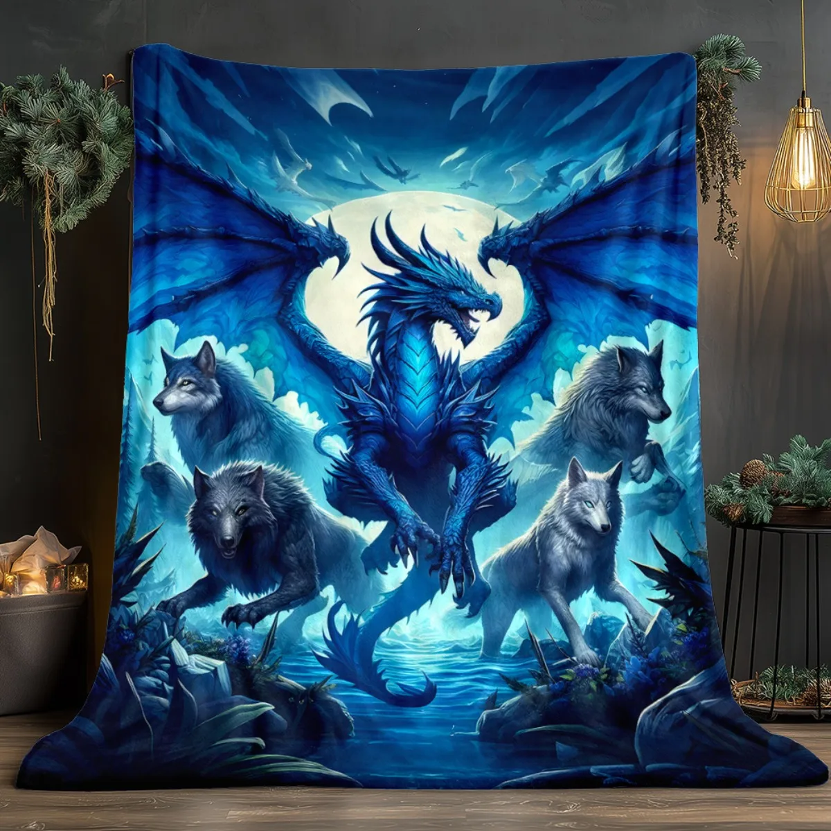 Dragon and Wolves Scene HD Printed Blanket, Soft and Warm Flannel Blanket for Travel, Camping, Sofa, Living Room, Couch, Chair,