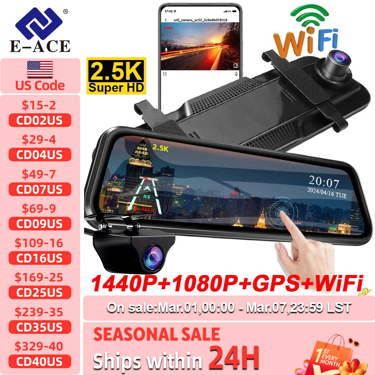 E-ACE 2.5K Mirror Camera For Car Touch Screen Video Recorder Rearview Mirror Dashcam 1440P GPS Wifi 24H Parking DVR Black Box