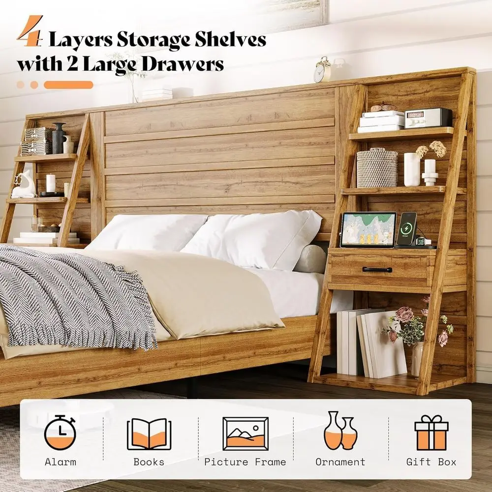 Farmhouse Style King Bed with Wide Headboard, 4-Tier Shelves, Charging Station, 2 Drawers, No Box Spring Required, Natural Oak F