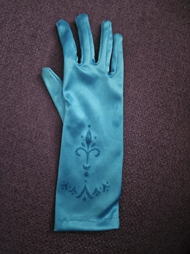 The perfect size for my 4 year old, who is absolutely obsessed with them and insists on wearing them whenever possible. For the pair i received (in dark blue), the glove colour is actually lighter than the decoration, which is different to the listing picture, but this didn’t bother me at all. The fabric is nice and silky with a bit of shine to it, and the decoration is similar to a glitter fabric paint with a nice subtle sparkle to it. I’m not sure on longevity as i haven’t washed them yet, but i would probably recommend a handwash (unless you’re a “everything in the machine, survival of the fittest” household like ours).