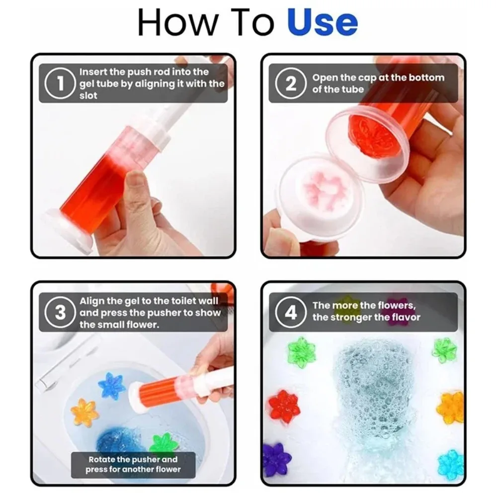 Usage: Gently squeeze the gel in the tube to the edge of the urinal or toilet with a push tube, and flush it with water to release fragrance. One can produce 12 flowers