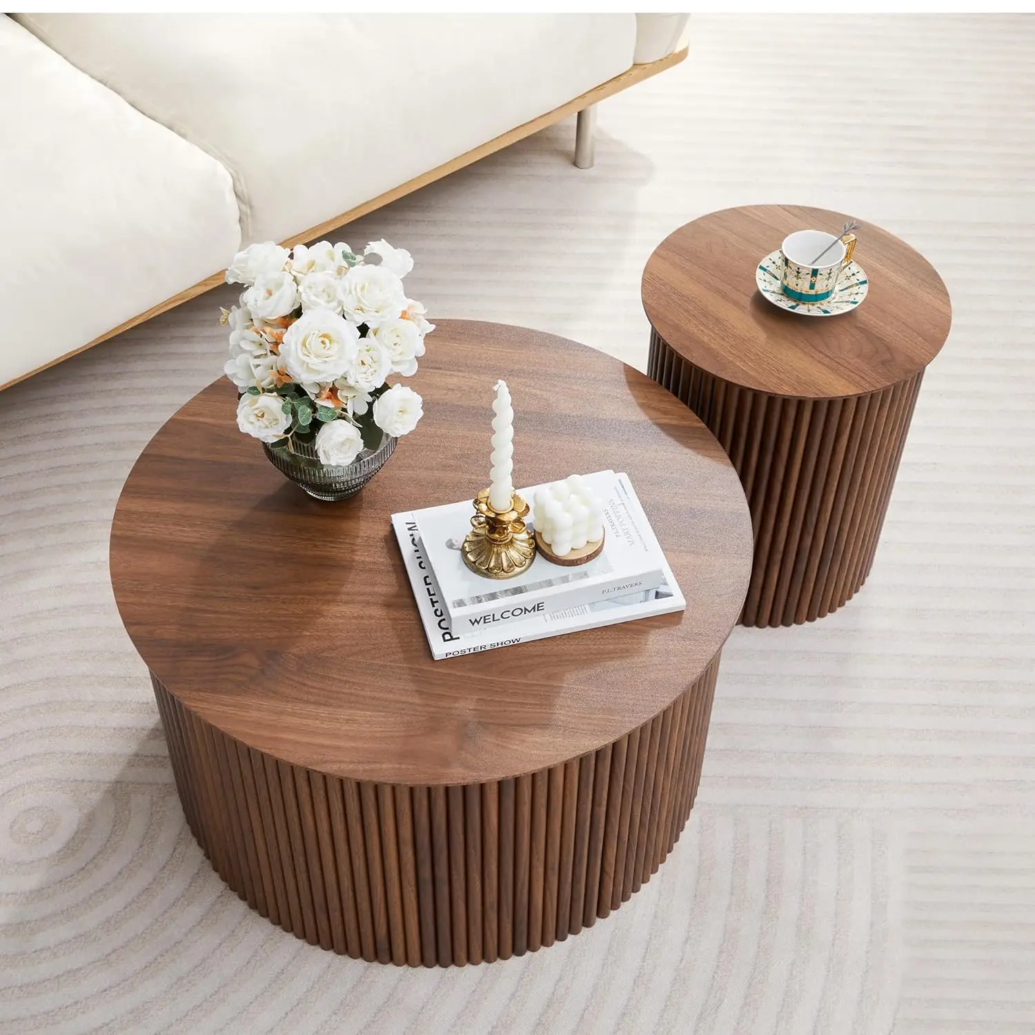 Fluted Round Coffee Table Set of 2: Elevate your living room with this round nesting coffee table set, showcasing elegant fluted paneling, smooth rounded edges, and warm wood grain tones. The mid century modern coffee table design combines artistry and practicality, enhancing your décor while preventing accidental bumps. Perfect for those who value functional yet stylish furniture, this modern round coffee table brings depth and charm to any living room, bedroom, or reading nook.