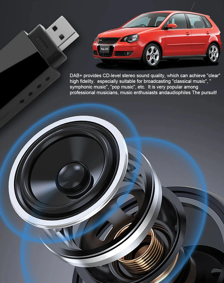 3.The new radio standard DAB: Digital Audio Broadcasting allows you multi-regional music with your local well-known and also new channels. CD sound quality and noise-free in excellent transmission make DAB Radio a special experience in the vehicle. Permanent increase in channels and expansion of the station area soon make DAB accessible to most of Europe.