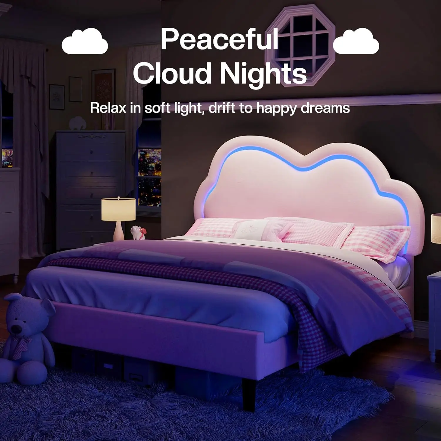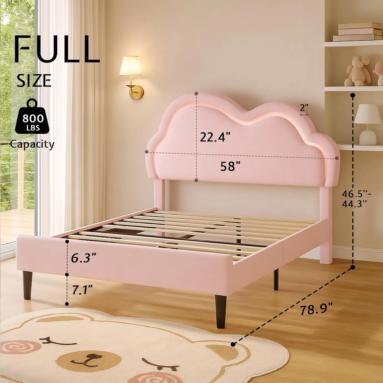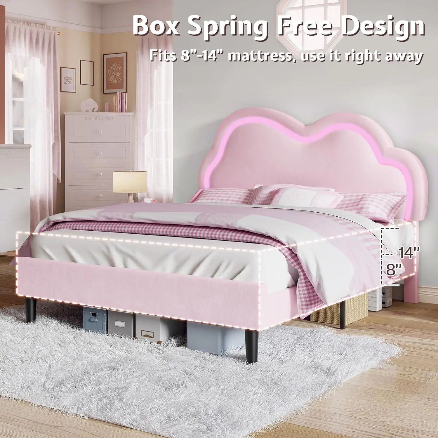 Full Bed Frame for Girls with Adjustable Cloud Headboard, Velvet Upholstered & RGB Lights, 7.1″ Underbed Storage, Customized