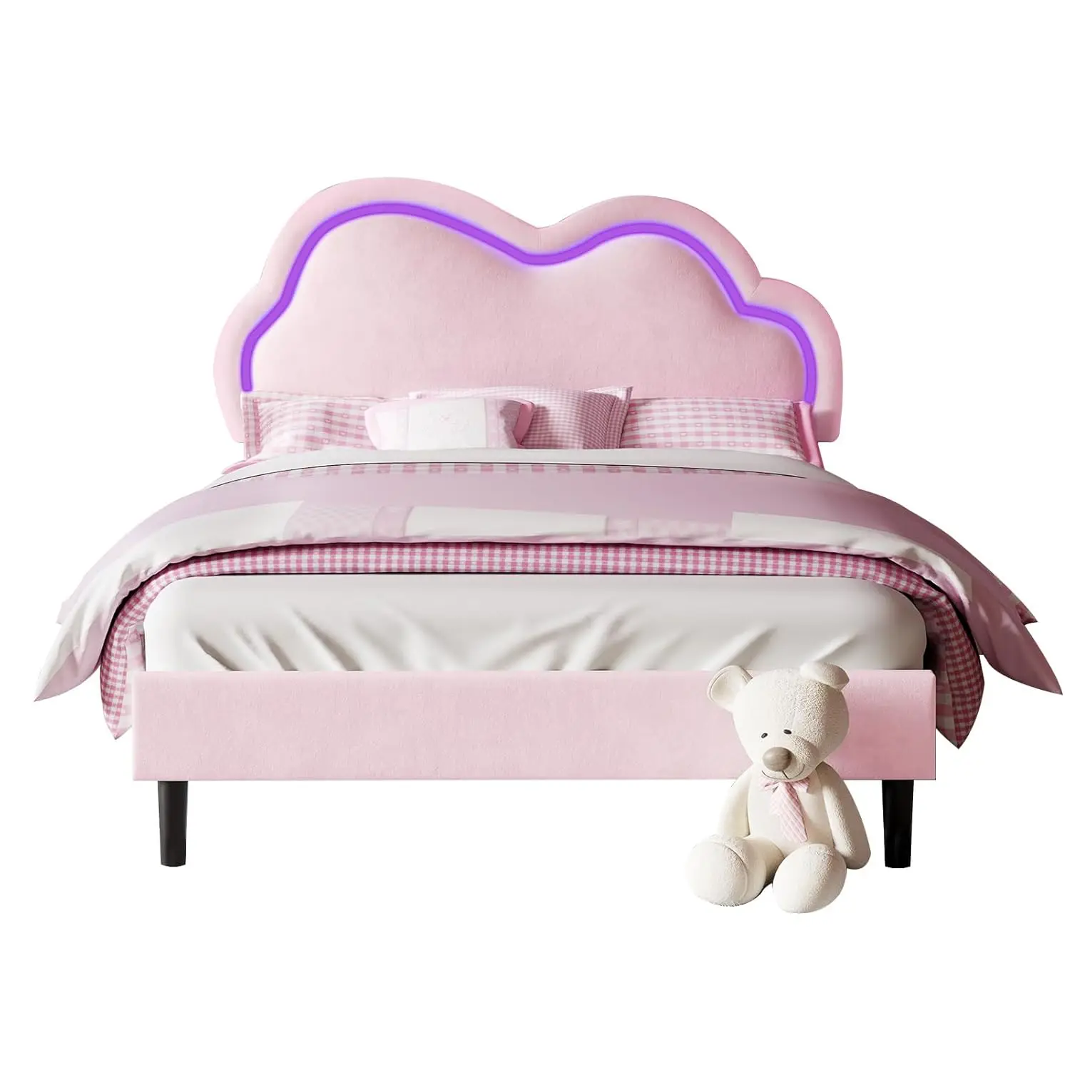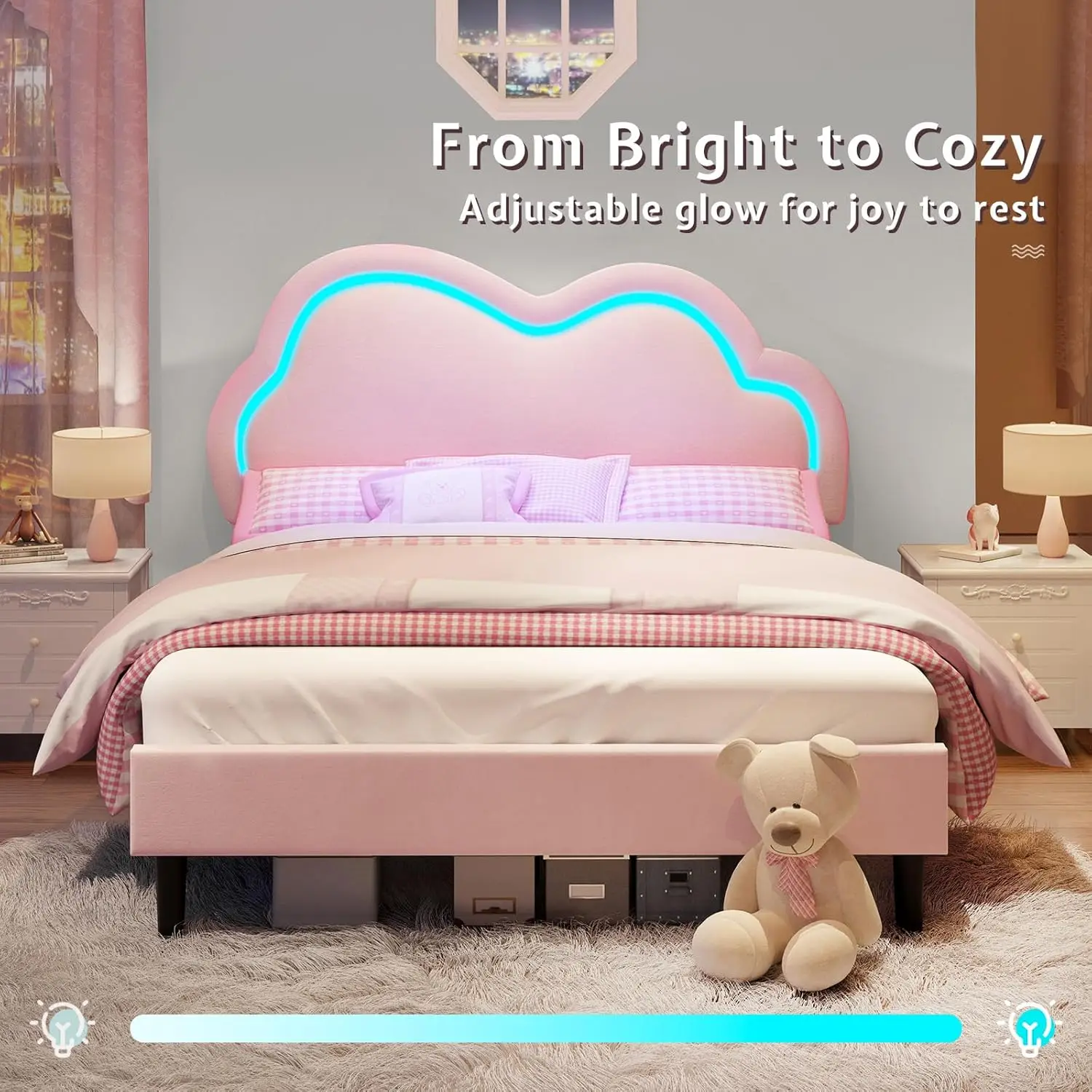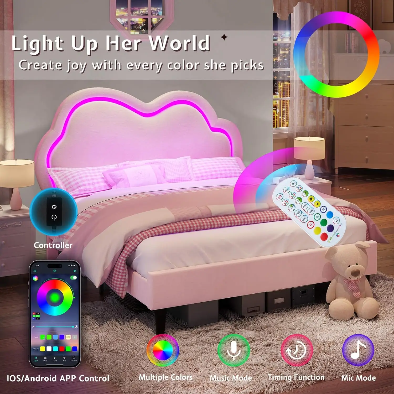 Full Bed Frame for Girls with Adjustable Cloud Headboard, Velvet Upholstered & RGB Lights, 7.1″ Underbed Storage, Customized