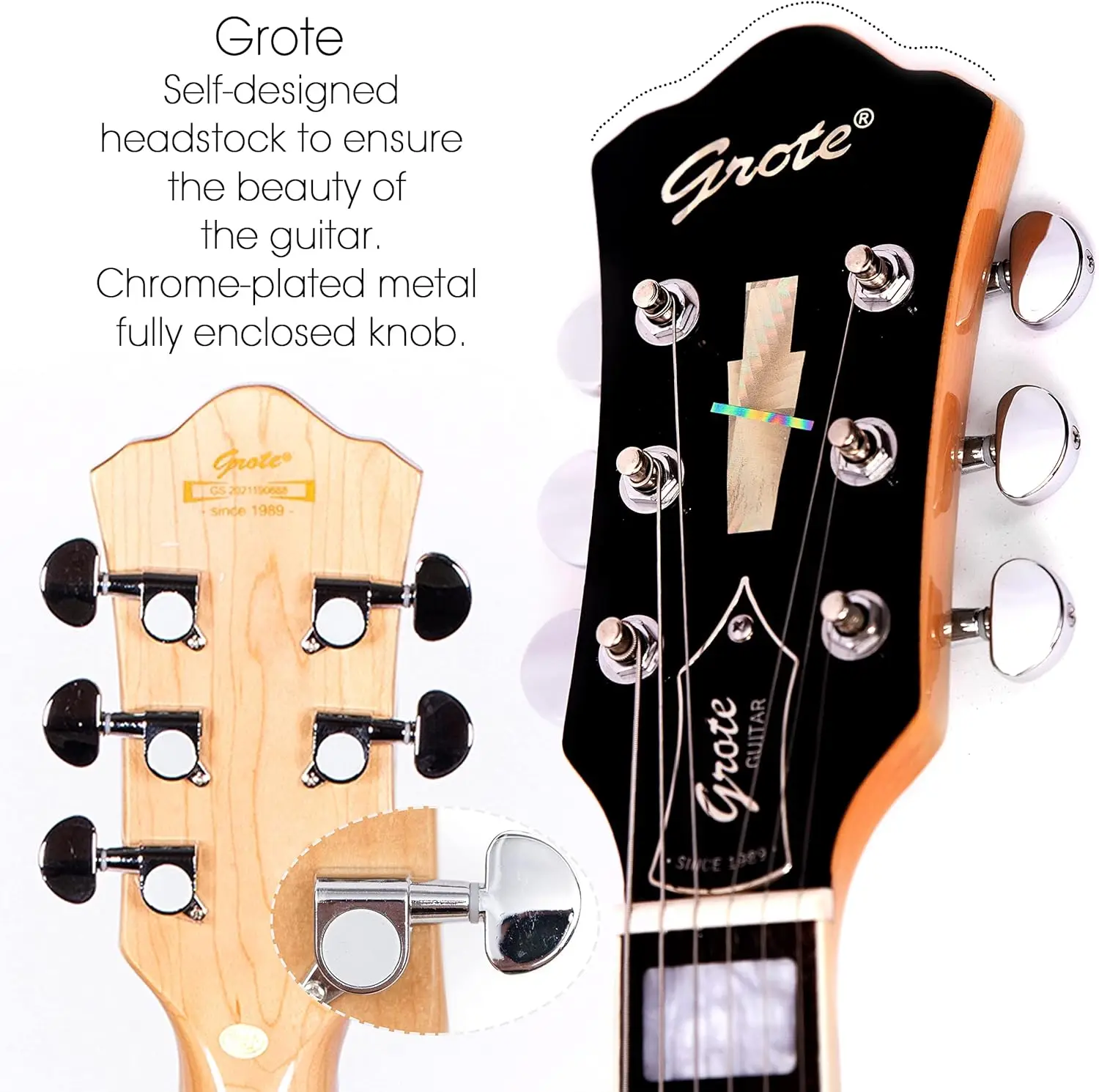 The Grote signature headstock, with laser markings on the metal truss rod cover, is an advanced anti-counterfeiting measure that ensures you are getting a genuine Grote guitar. |