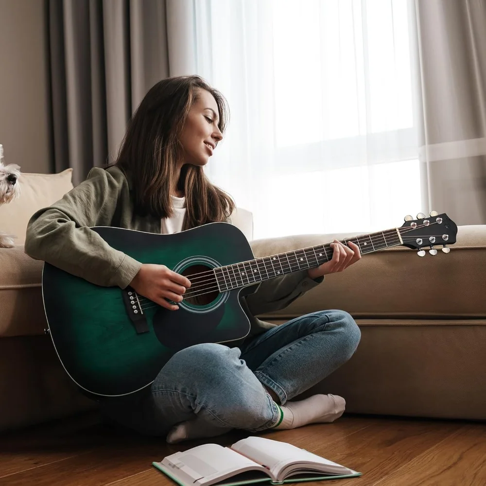 • 【UNIQUE DESIGH】The 6 strings 41-inch acoustic electric guitar uses cutaway design – a cut at the junction of the body and neck makes the treble frets easier to reach when playing. The matte green combined with the distressed effect makes this guitar look unusual. Smooth and coherent high-bass switching coupled with eye-catching appearance will make you the most dazzling star at a party or on stage.