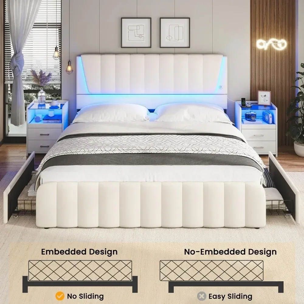 - *️⃣【Bed Frame with 4 Storage Drawers】Equipped with four large-capacity storage drawers underneath the platform bed frame queen size, each with four smooth wheels that can be easily pulled out and closed for easy storage of various bed linens, clothing, etc. Moreover, each drawer has its locking hole, which can prevent the drawers sliding around.