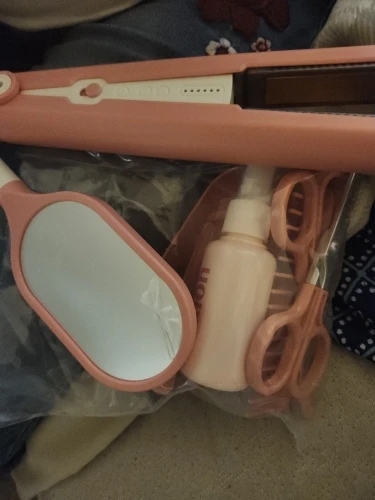 The package includes: scissors, comb, lipstick, spray, curling iron, bobby pins, headband