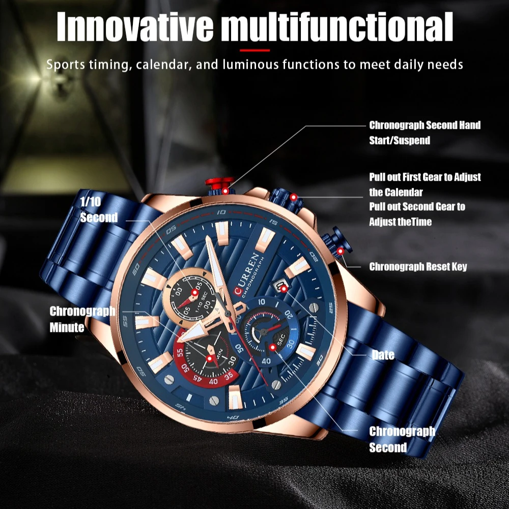 | Feature | Luminous, Chronograph, Complete Calendar, Water-Resistance |