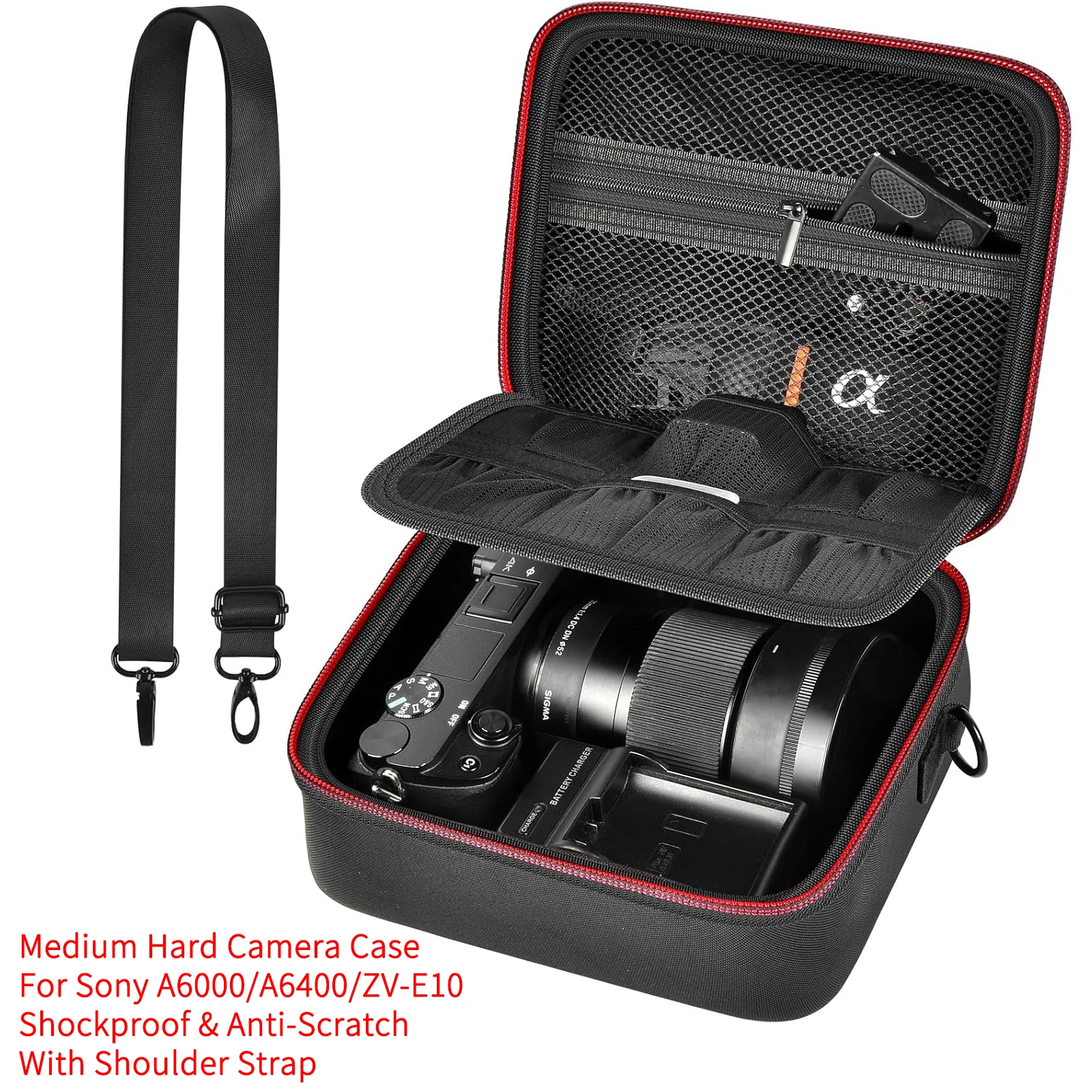 Hard Camera Case for Sony ZV-E10 A6400 A6000 A6100 A6600 A6500 (Medium,Kit Lens Only),Protective Bag with Shoulder Strap & Divid