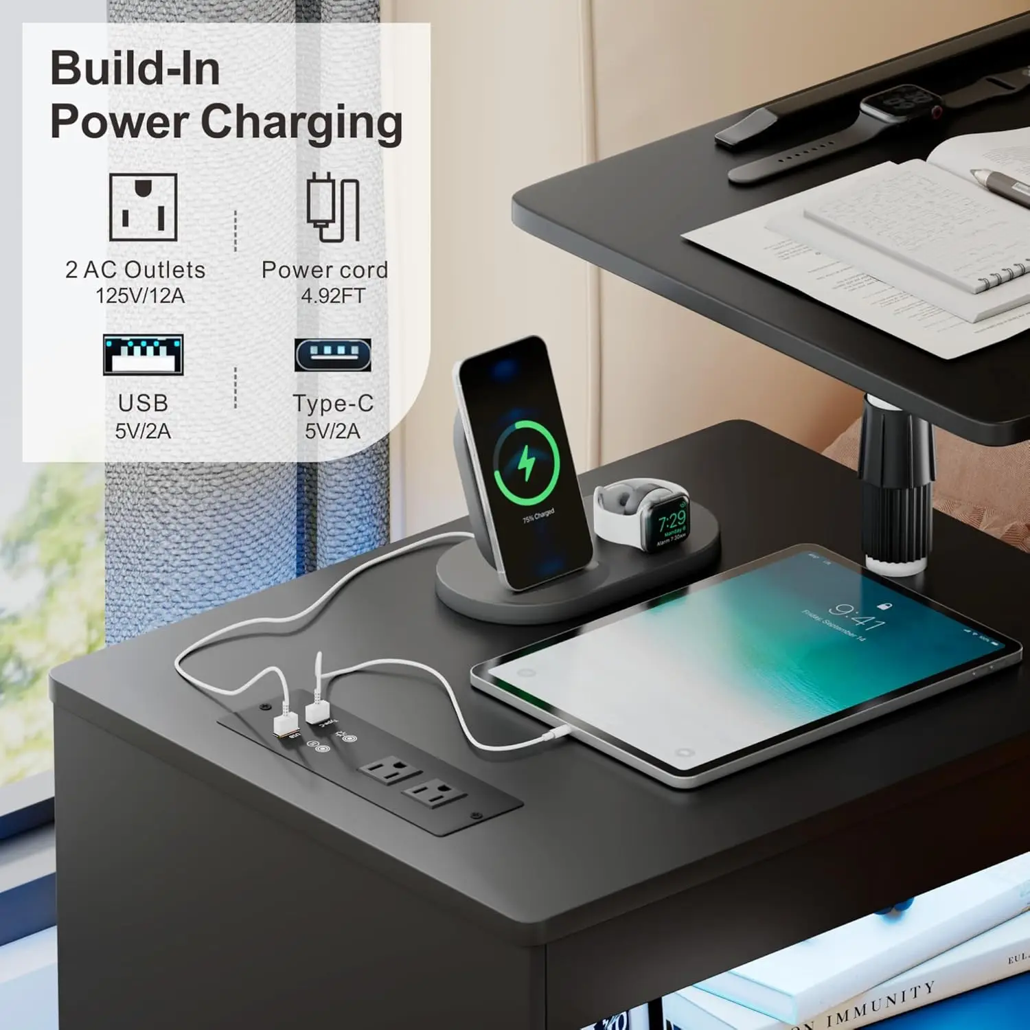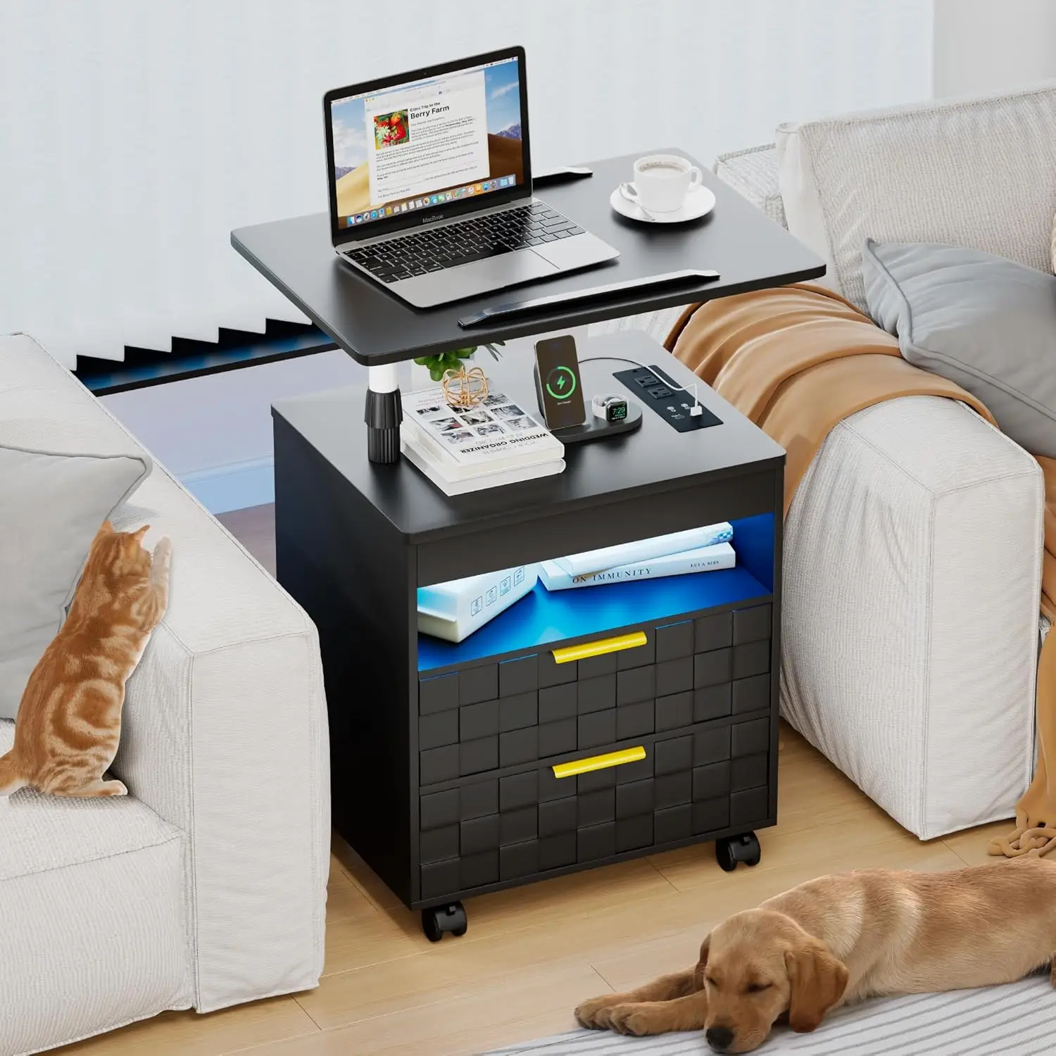 Rolling Workstation Sofa End Table with Lockable Wheels: The bedside table is equipped with 4 lockable wheels for moving easily, you can move it near bed to read or write in the living room near sofa side, also could move it to bedroom.