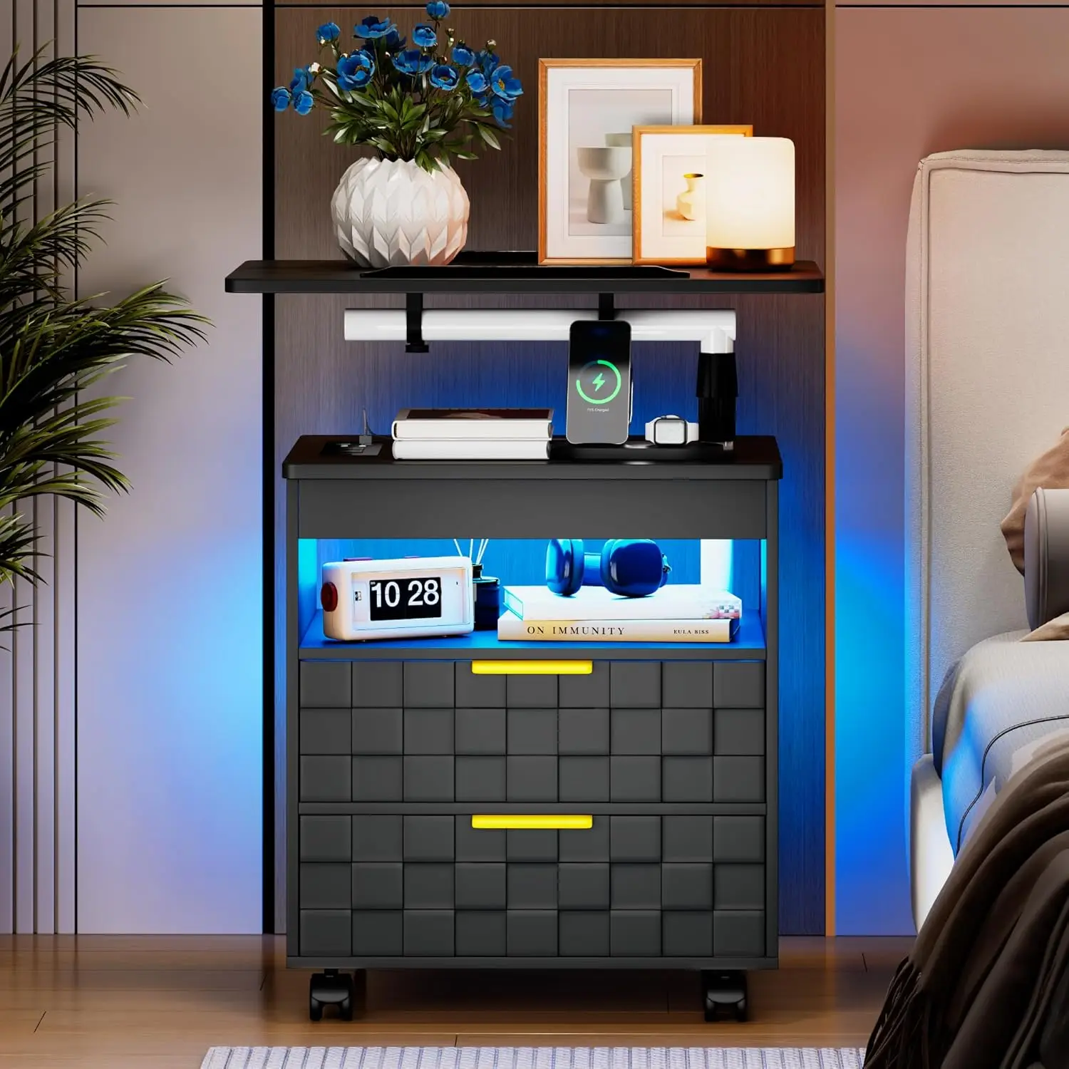 Height Adjustable Nightstand with Charging Station, LED Bedside Table 2 Drawers, Smart Wooden End Table Dorm, Customized