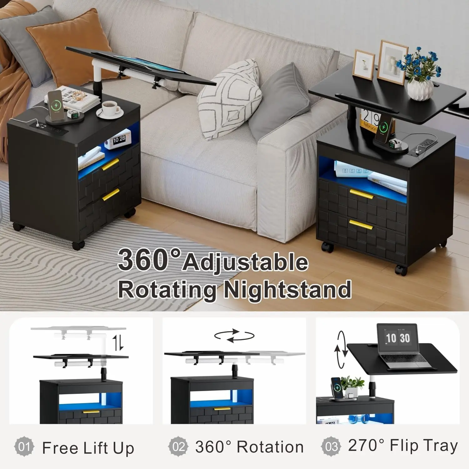 360° Adjustable Rotating Night Stand-Ergonomic Design: Top panel of nightstands swivels 360° rotation laterally. The laptop tray can go up and down with adjustable height for your need of height. 270° flip laptop tray offers a more comfortable working experience to hold laptop no matter on the bed or near the sofa.