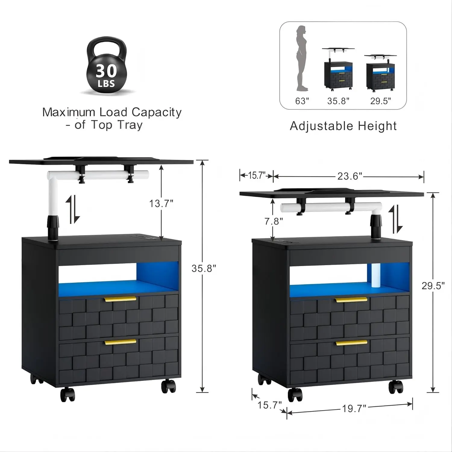Enough Storage Space Bed Side Table: Nightstand of 2 drawers and open shelf provide storage space to hold blankets, pajamas, books or frames, lamp on the top. Total size: 19.7×15.7×29.5-35.8 inches (LxDxH), Roling bedside tables is suit for samll space, as dorm, apartment, home office, bed side tables could move in the bedroom, or near the sofa in the living room.