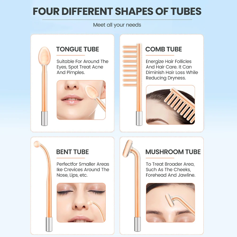 【Multifunctional 4 Different Tubes】High frequency facial machine comes with 4 different orange high frequency wands to meet all your needs, 1 x mushroom tube, 1 x tongue tube; 1 x bent tube; 1 x another tube. It can be applied to different areas. The mushroom tube is suitable for larger areas around the face; the tongue tube and the bend tube are suitable for smaller areas of the face.Day after day,you will see a better version of yourself!