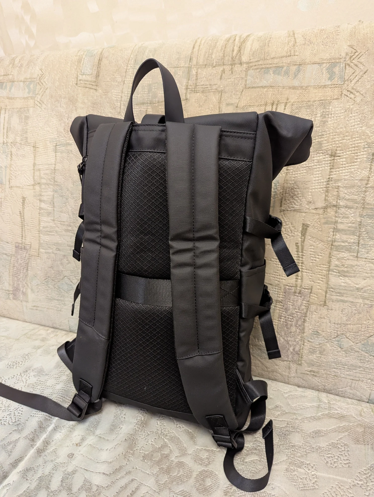 The volume of the laptop backpack varies from 18L to 27L, with the dimension of 30x15x45cm (rolled) and 30x15x60cm (unrolled). This is a very versatile backpack that can hold clothes for travelling, A4 tablets or 15.6 inch laptop.