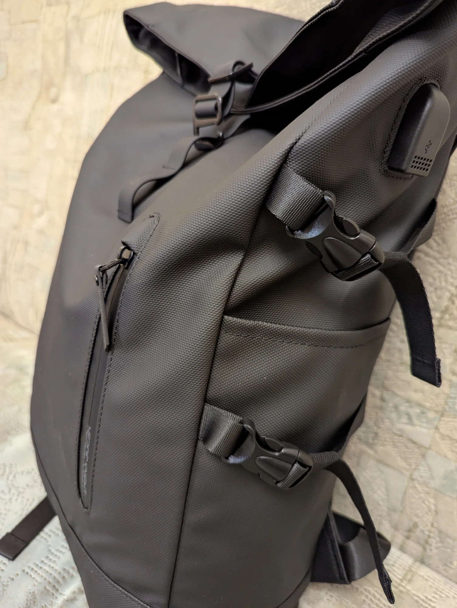 There are plenty of well designed compartments, including a padded laptop section and multiple internal pockets that keep everything organised. The waterproof fabric and overall construction give real confidence in bad weather. The usb port is a practical touch too.