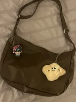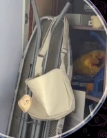 Beautiful milky color, but the material is thin, as is the lining of the bag. Don’t be alarmed by its shape; when you fill it with everything you need, beautiful folds will appear in the middle. And yes, for the first three days it will smell strongly of fish, but if you spray it with strong fragrances and air it out on the balcony, the smell will go away. The strap is thick and adjustable. can be carried by hand or as a sling, on the shoulders or across the body (very convenient to wear in any season). There are no pockets inside, just like there are no pockets outside. Notebooks can fit in it (if someone is planning to go to college or university with it, but I don’t recommend it for school). The set includes a cool plush keychain with a long chain (it also smells like fish, but it dissipates quickly). In principle, I am very satisfied with the purchase.