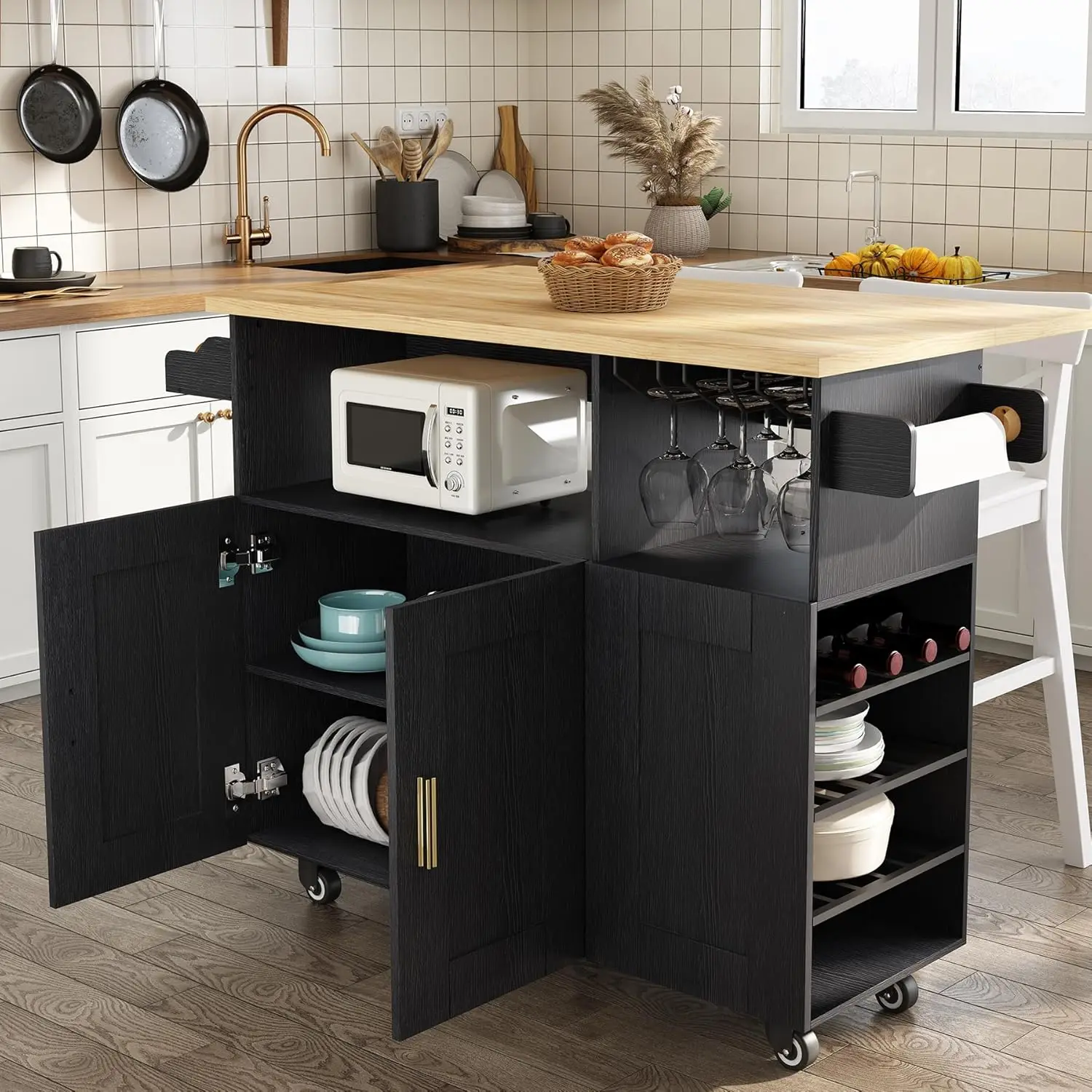 Rolling Mobile Kitchen Island Table With Storage Drop Leaf Countertop Power Socket Wheel Black Model 12