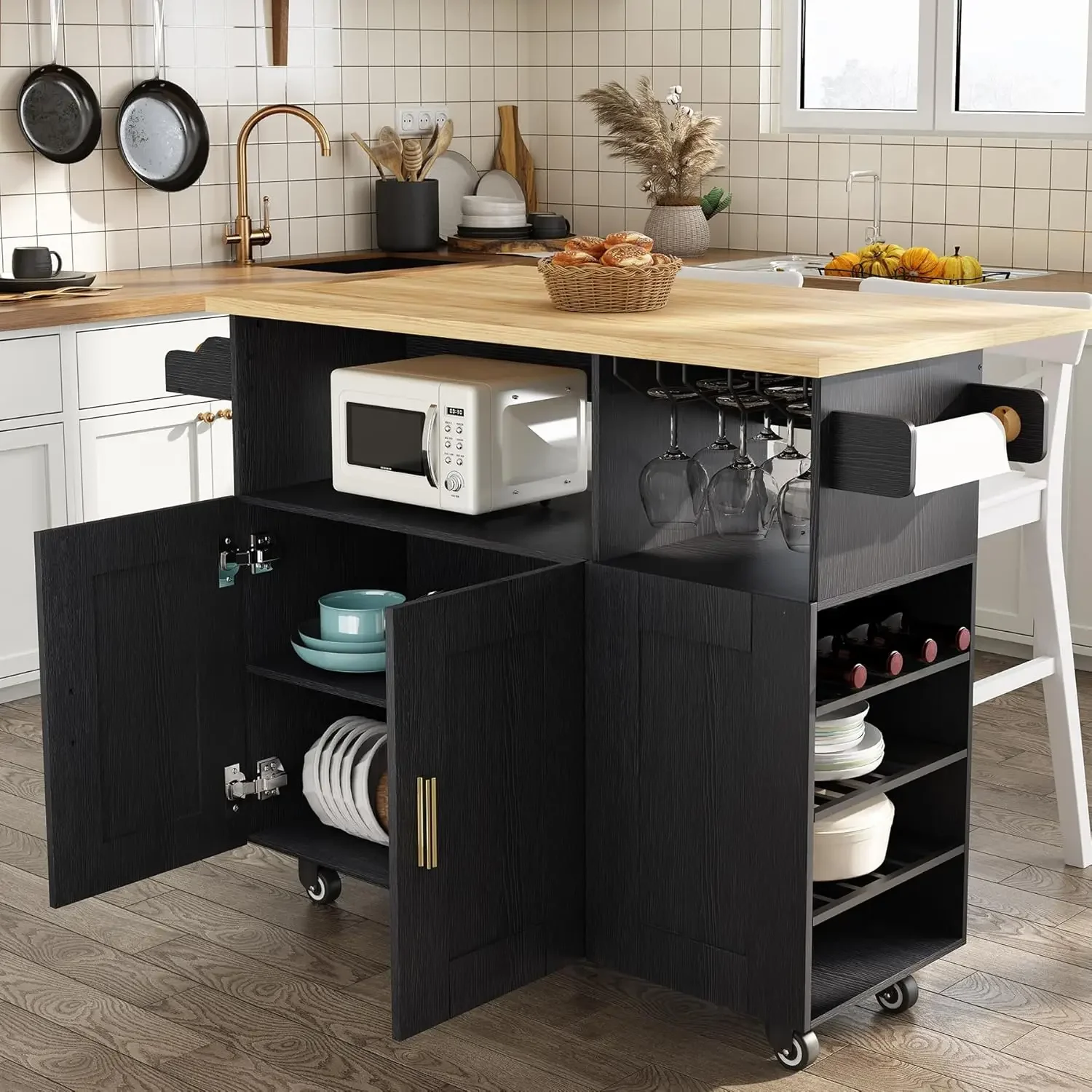 Hot sale!Rolling Mobile Kitchen Island Table With Storage Drop Leaf Countertop Power Socket Wheel Black Model 12